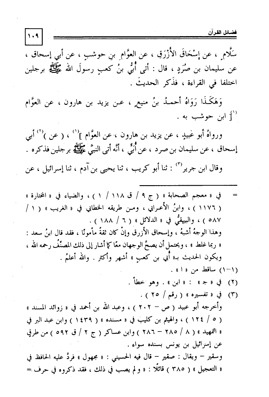 سلام، عن اسحاق الأزرق، عن العوام بن حوشب، عن أبى إسحاق، عن سليمان بن صرد، قال: أتى أُبَيّ بن كعب رسول الله -صَلَّى اللَّهُ عَلَيْهِ وَسَلَّمَ- برجلين اختلفا فى القراءة، فذكر الحديث.