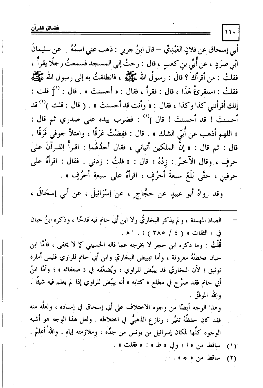 أبى إسحاق عن فلان العبدى -قال ابن جرير: ذهب عنى اسمه- عن سليمان بن صرد، عن أبى بن كعب، قال: رحت إلى المسجد فسمعت رجلا يقرأ، فقلت: من أقرأك؟ قال: رسول الله -صَلَّى اللَّهُ عَلَيْهِ وَسَلَّمَ، فانطلقت به إلى رسول الله -صَلَّى اللَّهُ عَلَيْهِ وَسَلَّمَ- فقلت: استقرئ هذا، قال: فقرأ، فقال: "أحسنت". قال1: [قلت: إنك اقرأتنى كذا وكذا، فقال: "وأنت قد أحسنت". "قال: قلت"2 قد أحسنت! قد أحسنت! قال] 1: فضرب بيده على صدرى ثم قال: "اللهم أذهب عن أُبَيّ الشك". قال: ففضت عرقا، وامتلأ جوفى فرقًا, قال: ثم قال: "إن الملكين أتياني، فقال أحدهما: اقرأ القرآن على حرف، وقال الآخر: زده" , قال: "قلت: "زدنى" , فقال: اقرأه على حرفين، حتى بلغ سبعة أحرف، اقرأه على سبعة أحرف".