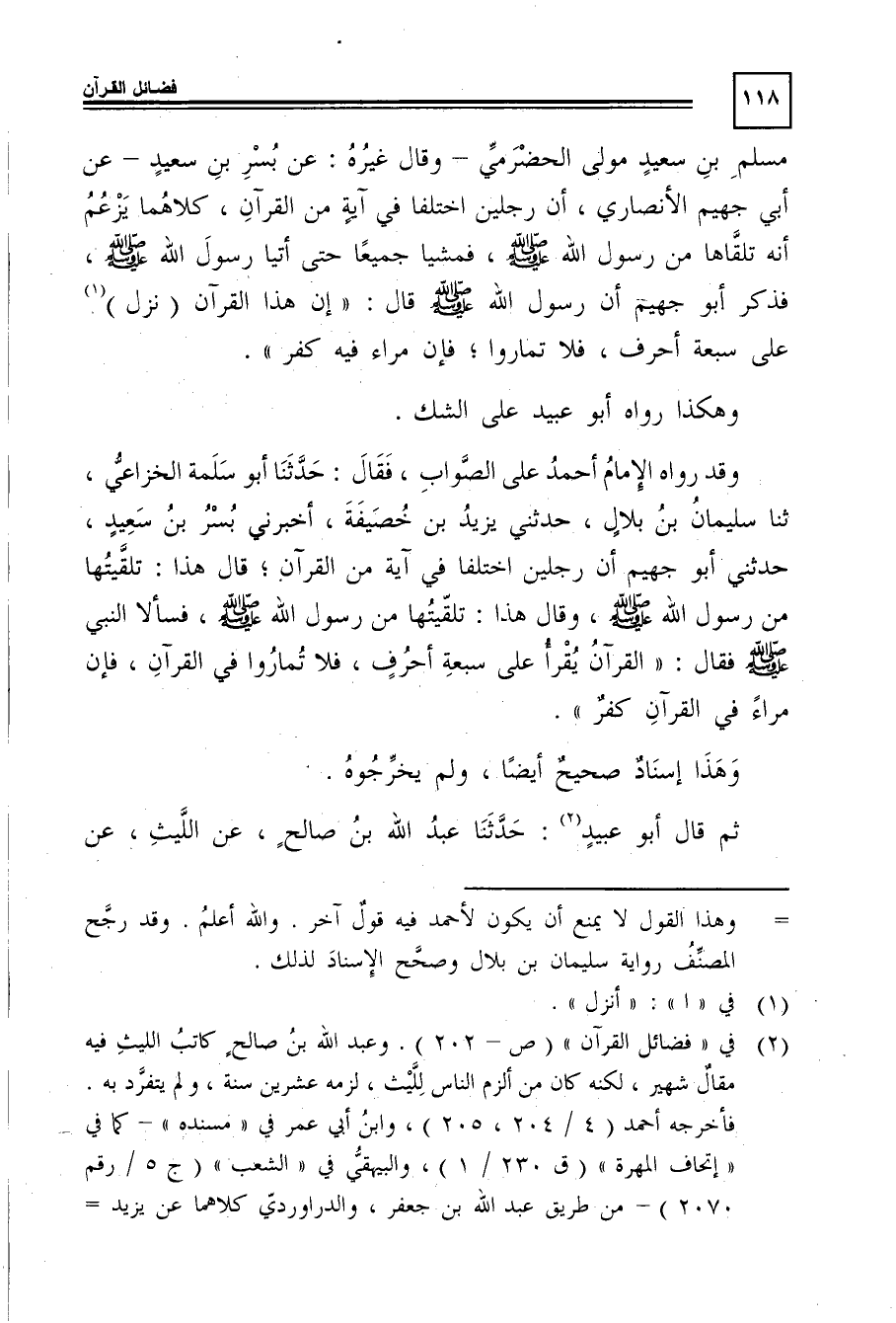 وقد رواه الإمام أحمد على الصواب، فقال: حدثنا أبو سلمة الخزاعى، ثنا سليمان بن بلال، حدثنى يزيد بن خُصَيْفَة، أخبرني بُسْر بن سعيد، حدثني أبو جُهَيْمٍ أن رجلين اختلفا فى آية من القرآن, قال هذا: تلقيتها من رسول الله -صَلَّى اللَّهُ عَلَيْهِ وَسَلَّمَ، وقال هذا: تلقيتها من رسول الله -صَلَّى اللَّهُ عَلَيْهِ وَسَلَّمَ، فسألا النبي -صَلَّى اللَّهُ عَلَيْهِ وَسَلَّمَ- فقال: "القرآن يُقْرَأُ على سبعة أحرف، فلا تماروا فى القرآن، فإن مراء في القرآن كفرٌ".