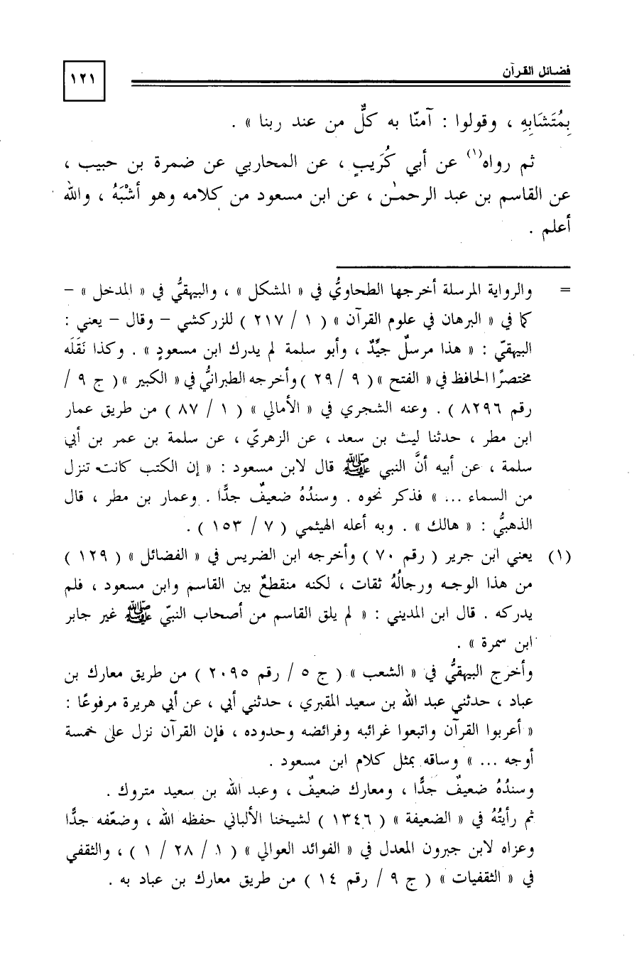 1 يعني ابن جرير "رقم 70", وأخرجه ابن الضريس في "الفضائل" "129" من هذا الوجه ورجاله ثقات، لكنه منقطع بين القاسم وابن مسعود، فلم يدركه, قال ابن المديني: "لم يلق القاسم من أصحاب النبي -صَلَّى اللَّهُ عَلَيْهِ وَسَلَّمَ- غير جابر بن سَمُرَة".