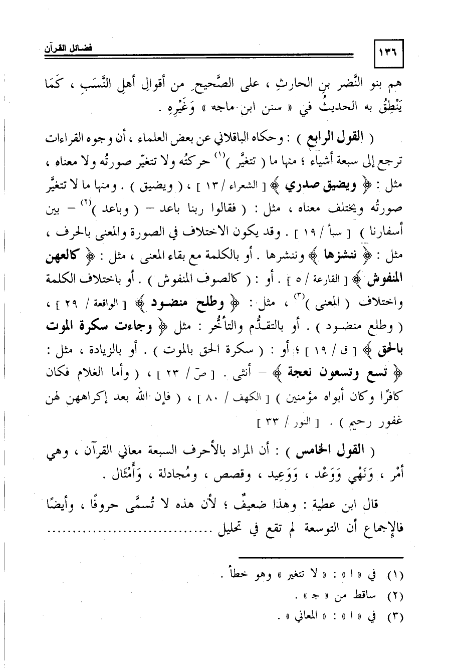 "القول الرابع": وحكاه الباقلانى عن بعض العلماء، أن وجوه القراءات ترجع إلى سبعة أشياء؛ منها ما "تتغيَّر"1 حركته ولا تتغيَّر صورته ولا معناه، مثل: {وَيَضِيقُ صَدْرِي} [الشعراء: 13] ، "ويضيق". ومنها ما لا تتغيَّر صورته ويختلف معناه، مثل: {فَقَالُوا رَبَّنَا بَاعِدْ -باعد2- بَيْنَ أَسْفَارِنَا} [سبأ: 19] . وقد يكون الاختلاف فى الصورة والمعنى بالحرف، مثل: {نُنْشِزُهَا} وننشرها. أو بالكلمة مع بقاء المعنى، مثل: {كَالْعِهْنِ الْمَنْفُوشِ} [القارعة: 5] , أو: "كالصوف المنفوش". أو باختلاف الكلمة واختلاف "المعنى"3، مثل: {وَطَلْحٍ مَنْضُودٍ} [الواقعة: 29] ، "وطلع منضود". أو بالتقدم والتأخر: مثل {وَجَاءَتْ سَكْرَةُ الْمَوْتِ بِالْحَقِّ} [ق: 19] أو: "سكرة الحق بالموت". أو بالزيادة، مثل: {تِسْعٌ وَتِسْعُونَ نَعْجَة} -أنثى. [ص: 23] ، "وأما الغلام فكان كافرًا وكان أبواه مؤمنين" [الكهف: 80] ، "فإن الله بعد اكراههن لهن غفور رحيم" [النور: 33] .