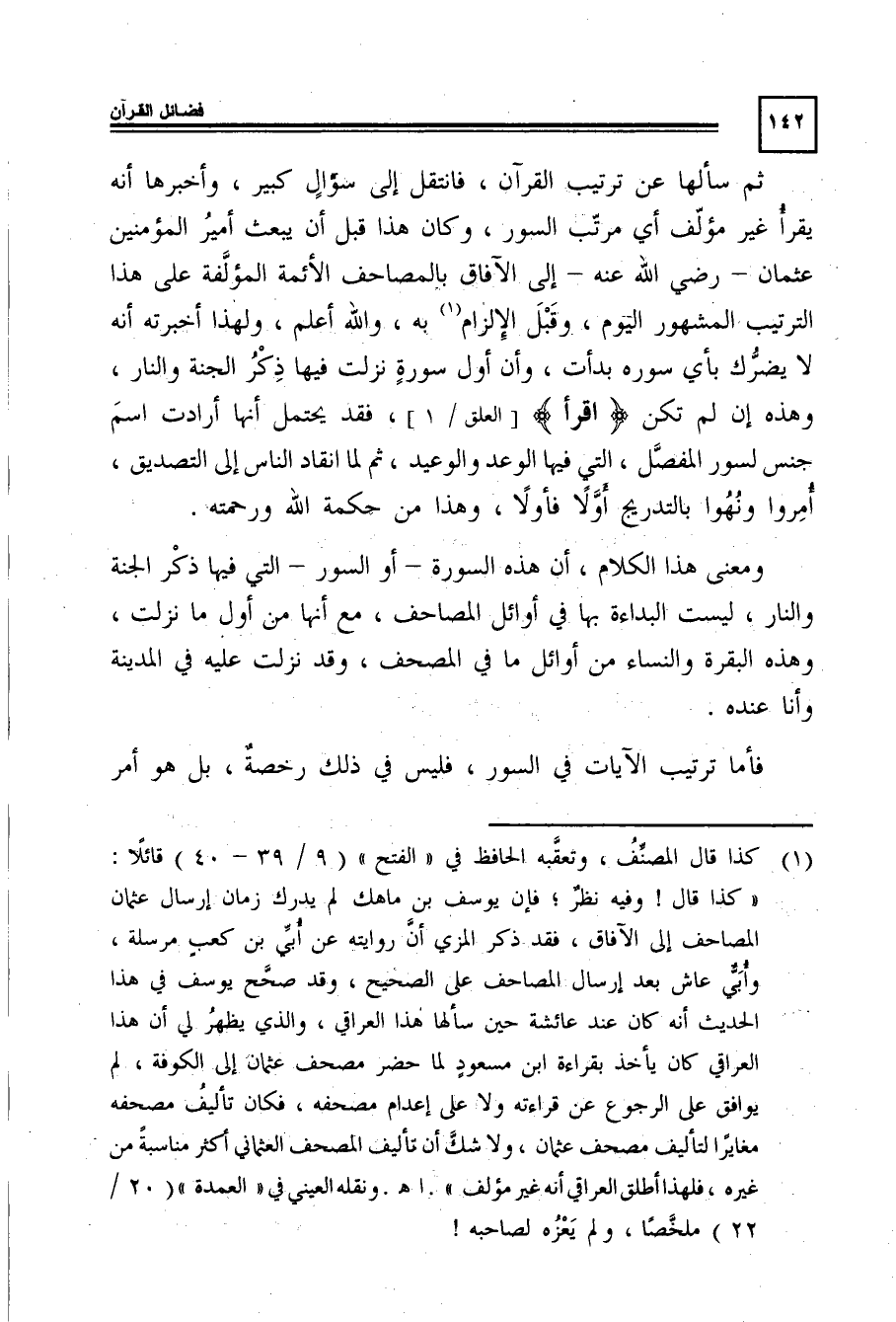 ومعنى هذا الكلام، أن هذه السورة -أو السور- التي يها ذكر الجنة والنار، ليست البداءة بهاء فى أوائل المصاحف، مع أنها من أول ما نزلت، وهذه البقرة والنساء من أوائل ما فى المصحف، وقد نزلت عليه فى المدينة وأنا عنده.