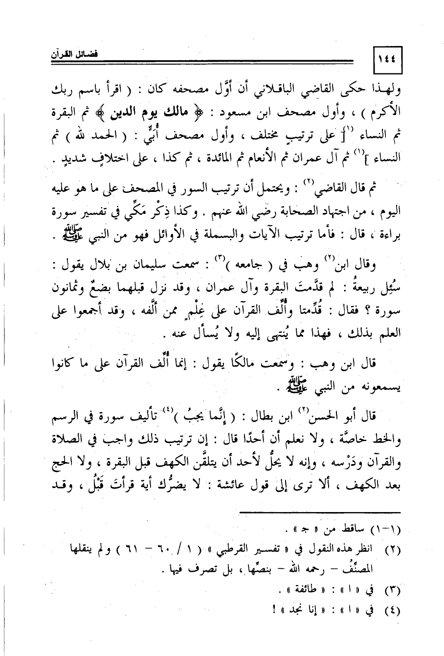 ولهذا حكى القاضى الباقلانى أن أوَّل مصحفه كان: "اقرأ باسم ربك الأكرم"، وأول مصحف ابن مسعود: {مَالِكِ يَوْمِ الدِّينِ} ثم البقرة ثم النساء1 [على ترتيب مختلف، وأول مصحف أُبَيّ: "الحمد لله" ثم النساء] 1 ثم آل عمران, ثم الأنعام, ثم المائدة، ثم كذا، على اختلاف شديد.