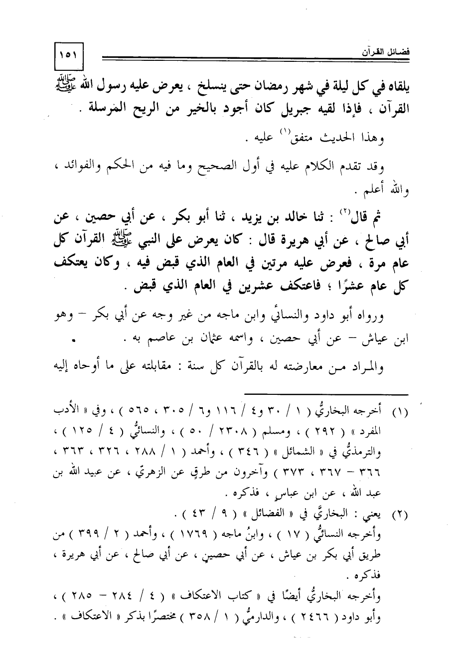 ثم قال2: ثنا خالد بن يزيد، ثنا أبو بكر، عن أبى حصين، عن أبى صالح، عن أبى هريرة قال: كان يعرض على النبى -صَلَّى اللَّهُ عَلَيْهِ وَسَلَّمَ- القرآن كل عام مره، فعرض عليه مرتين فى العام الذى قبض فيه، وكان يعتكف كل عام عشرًا؛ فاعتكف عشرين في العالم الذي قبض.