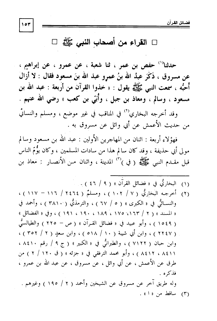 حدثنا1 حفص بن عمر، ثنا شعبة، عن عمرو، عن إبراهيم، عن مسروق، ذكر عبد الله بن عمرو عبد الله بن مسعود فقال: لا أزال أحبه، سمعت النبى -صَلَّى اللَّهُ عَلَيْهِ وَسَلَّمَ- يقول: "خذوا القرآن من أربعة: عبد الله بن مسعود، وسالم، ومعاذ بن جبل، وأُبَيّ بن كعب" رضى الله عنهم.