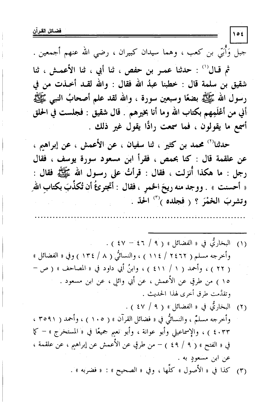 ثم قال1: حدَّثَنا عمر بن حفص، ثنا أبى، ثنا الأعمش، ثنا شقيق بن سلمة قال: خطبنا عبد الله فقال: والله لقد أخذت من فِي رسول الله -صَلَّى اللَّهُ عَلَيْهِ وَسَلَّمَ- بضعا وسبعين سورة، والله لقد علم أصحاب النبى -صَلَّى اللَّهُ عَلَيْهِ وَسَلَّمَ- أنى من أعلمهم بكتاب الله وما أنا بخيرهم. قال شقيق: فجلست فى الحلق أسمع ما يقولون، فما سمعت رادًّا يقول غير ذلك.
