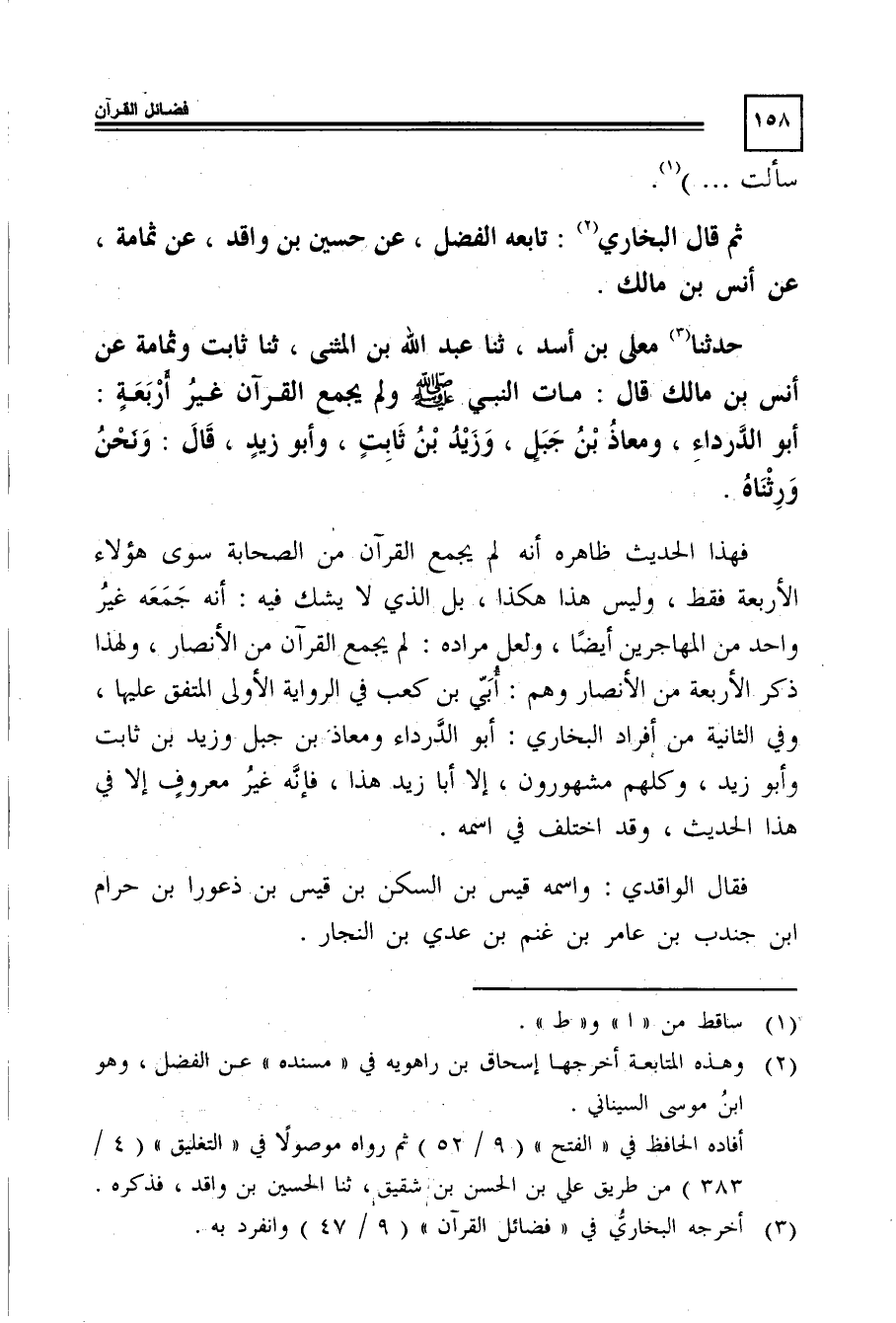 حدَّثََنَا3 معلى بن أسد، ثنا عبد الله بن المثنى، ثنا ثابت وثمامة عن أنس بن مالك قال: مات النبى -صَلَّى اللَّهُ عَلَيْهِ وَسَلَّمَ- ولم يجمع القرآن غير أربعة: أبو الدرداء، ومعاذ بن جبل، وزيد بن ثابت، وأبو زيد، قال: ونحن ورثناه.