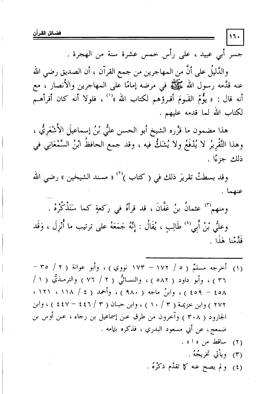 والدليل على أن من المهاجرين مَنْ جمع القرآن، أن الصِّدِّيقَ -رضي الله عنه- قَدَّمَه رسول الله -صَلَّى اللَّهُ عَلَيْهِ وَسَلَّمَ- فى مرضه إماما على المهاجرين والأنصار، مع أنه قال: "يَؤُمُّ القوم أقرؤهم لكتاب الله" 1، فلولا أنه كان اقرأهم لكتاب الله لما قدَّمَه عليهم.