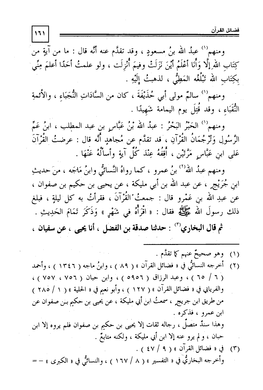2 أخرجه النسائي في "فضائل القرآن" "89"، وابن ماجه "1346"، وأحمد والفريابي في "فضائل القرآن" "127"، وأبو نعيم في "الحلية" "1/ 285" من طريق ابن جريج، سمعت ابن أبى مليكة، عن يحيى بن حكيم بن صفوان عن ابن عمرو، فذكره.