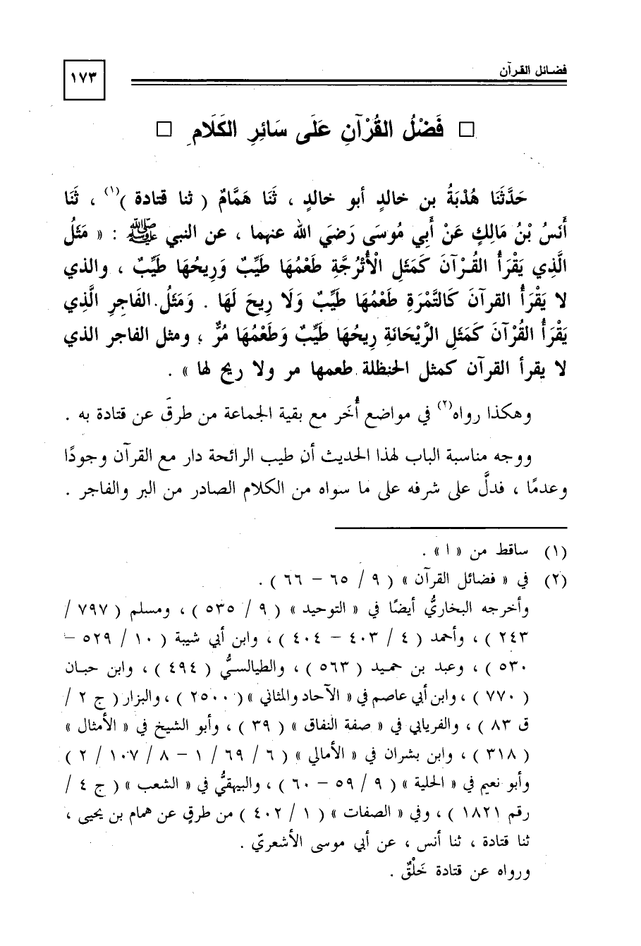 حدَّثَنا هدبة بن خالد أبو خالد، ثنا همَّام "ثنا قتادة"1، ثنا أنس بن مالك, عن أبى موسى -رضى الله عنهما، عن النبى -صَلَّى اللَّهُ عَلَيْهِ وَسَلَّمَ: "مَثَلُ الذى يقرأ القرآن كمَثَلِ الأُتْرُجَّة؛ طعمُها طيبٌ وريحها طيبٌ، والذي لا يقرأ القرآن كالتَّمرة؛ طعمُها طيبٌ ولا ريحَ لها، ومَثَلُ الفاجر الذى يقرأ القرآن كَمَثَلِ الريحانة؛ ريحُها طيبٌ وطعمُها مُرٌّ، ومَثَلُ الفاجر الذى لا يقرأ القرآن كَمَثَلِ الحنظلة؛ طعمُها مُرٌّ ولا ريح لها".