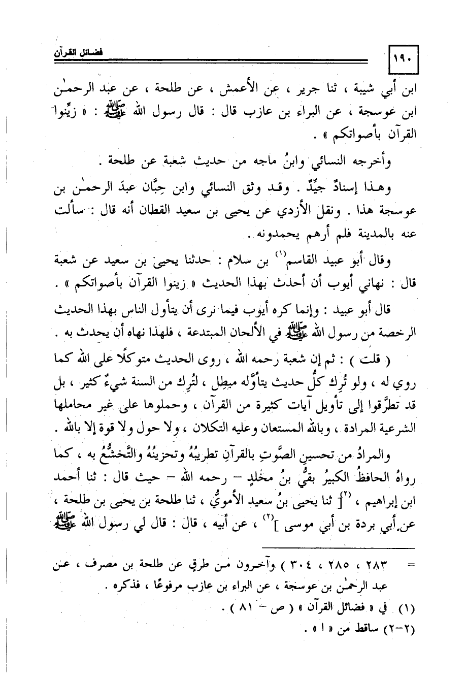 ابن أبى شيبة، ثنا جرير، عن الأعمش، عن طلحة، عن عبد الرحمن ابن عوسجة، عن البراء بن عازب قال: قال رسول الله -صَلَّى اللَّهُ عَلَيْهِ وَسَلَّمَ: "زيِّنُوا القرآن بأصواتكم".