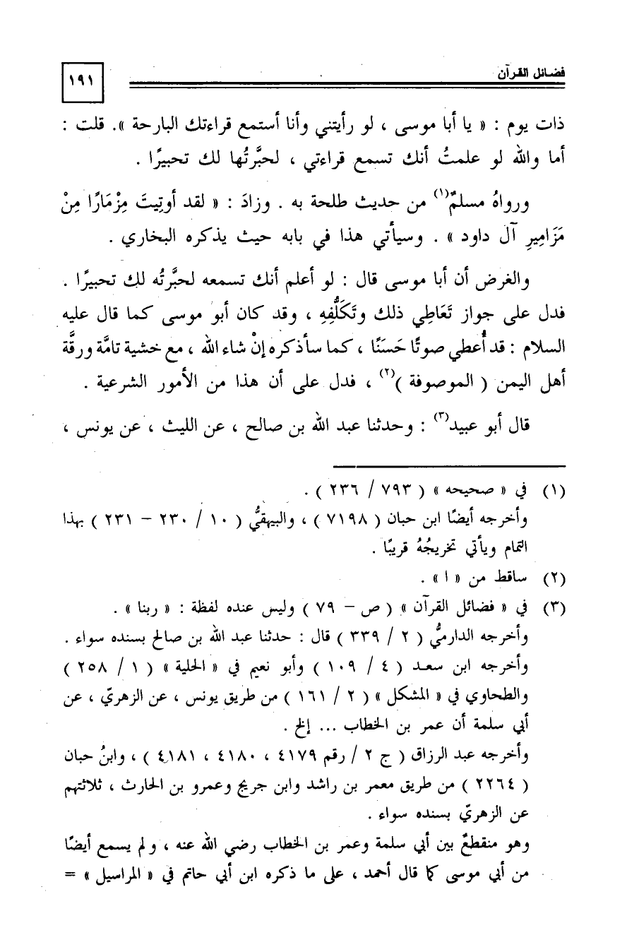 ورواه مسلم1 من حديث طلحة به. وزاد: "لقد أوتيت مزمارًا من مزامير آل داود". وسيأتى هذا فى بابه حيث يذكره البخارى.
