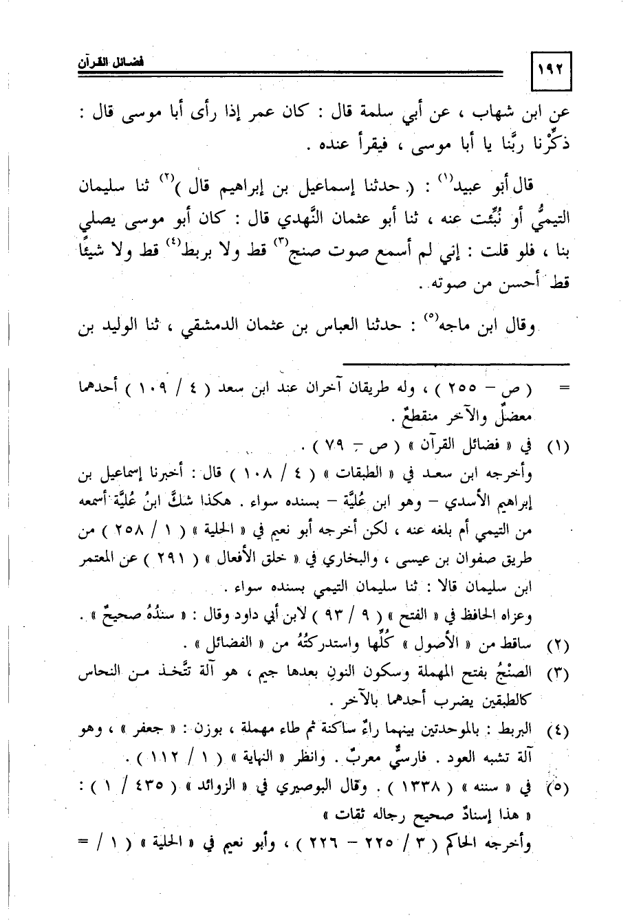 قال أبو عبيد1: "حدثنا إسماعيل بن إبراهيم قال"2: ثنا سليمان التيمى أو نبئت عنه، ثنا أبو عثمان النهديّ قال: كان أبو موسى يصلى بنا، فلو قلت: أنى لم أسمع صوت صَنْجٍ3 قط, ولا بَرْبَطٍ4 قط, ولا شيئًَا قط أحسن من صوته.