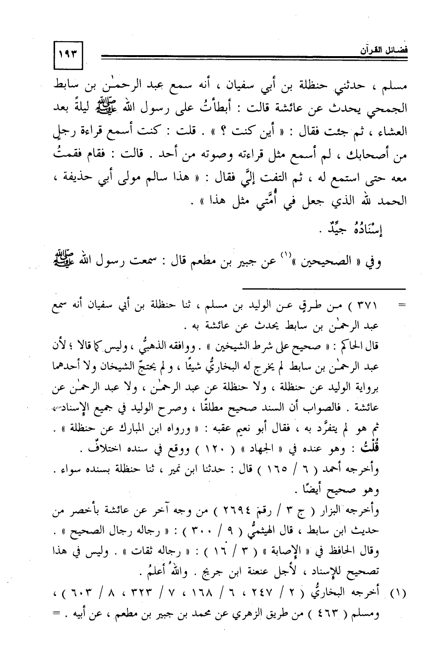 = 371" من طرق عن الوليد بن مسلم، ثنا حنظلة بن أبي سفيان أنه سمع عبد الرحمن بن سابط يُحَدِّثُ عن عائشة به.