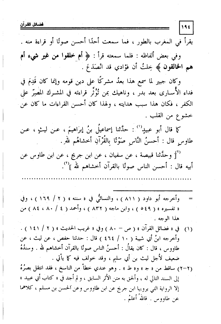 1 في "فضائل القرآن" "ص80", وفي "غريب الحديث" "2/ 141", وأخرجه ابن أبي شيبة "10/ 464" قال: حدَّثَنَا حفص، عن ليث، عن طاوس، قال: كان يقال: أحسن الناس صوتًا بالقرآن أخشاهم لله. وسنده ضعيف لأجل ليث بن أبي سليم، وقد خولف فيه كما يأتي.