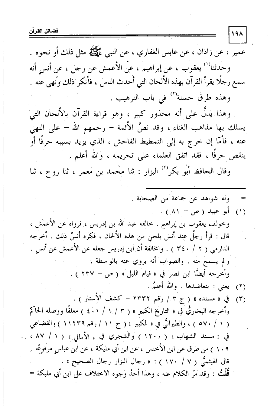 وحدَّثَنَا1 يعقوب، عن ابراهيم، عن الأعمش, عن رجل، عن أنس أنه سمع رجلًا يقرأ القرآن بهذه الألحان التى أحدث الناس، فأنكر ذلك ونهى عنه, وهذه طرق حسنة2 في باب الترهيب.