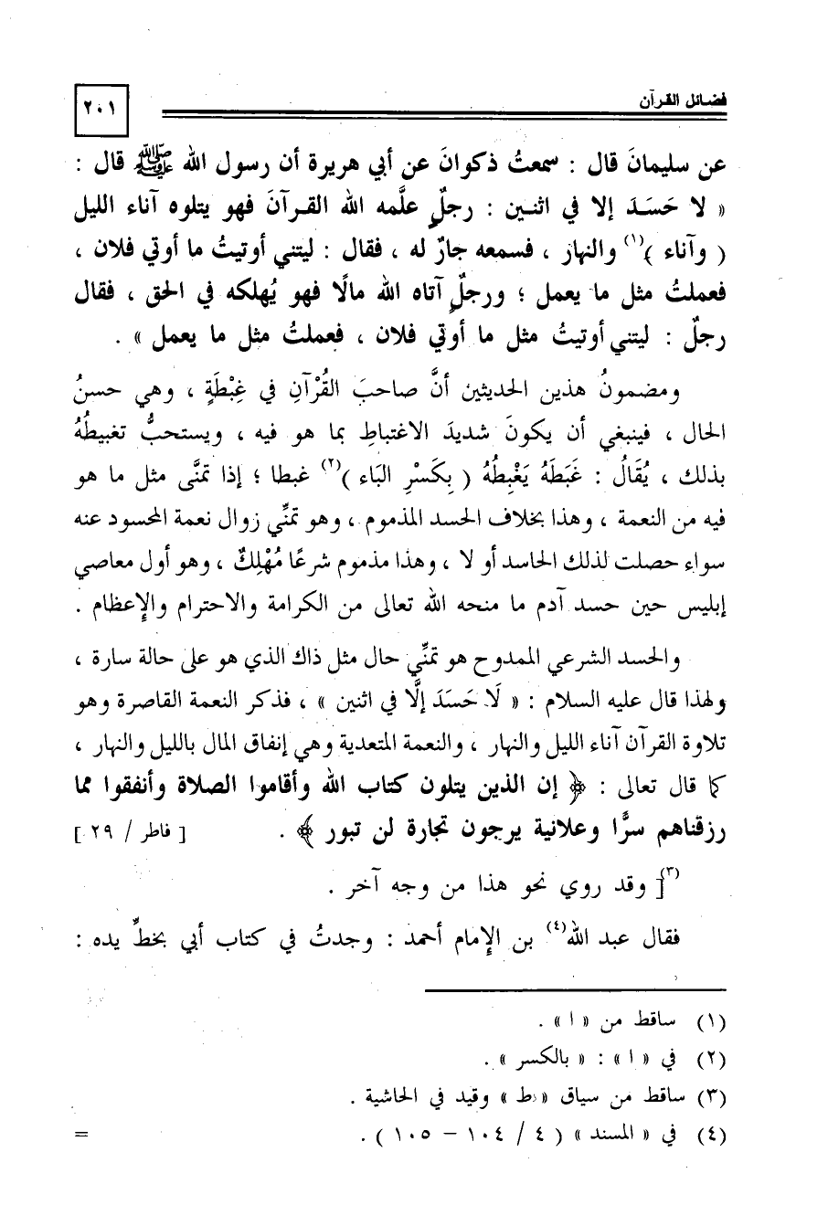 والحسد الشرعى الممدوح هو تمنِّي حال مثل ذاك الذى هو على حالة سارة، ولهذا قال -عليه السلام: "لا حسد إلا في اثنين"، فذكر النعمة القاصرة وهو تلاوة القرآن آناء الليل والنهار، والنعمة المتعدية وهي إنفاق المال بالليل والنهار، كما قال تعالى: {إِنَّ الَّذِينَ يَتْلُونَ كِتَابَ اللَّهِ وَأَقَامُوا الصَّلاةَ وَأَنْفَقُوا مِمَّا رَزَقْنَاهُمْ سِرًّا وَعَلانِيَةً يَرْجُونَ تِجَارَةً لَنْ تَبُورَ} [فاطر: 29] .