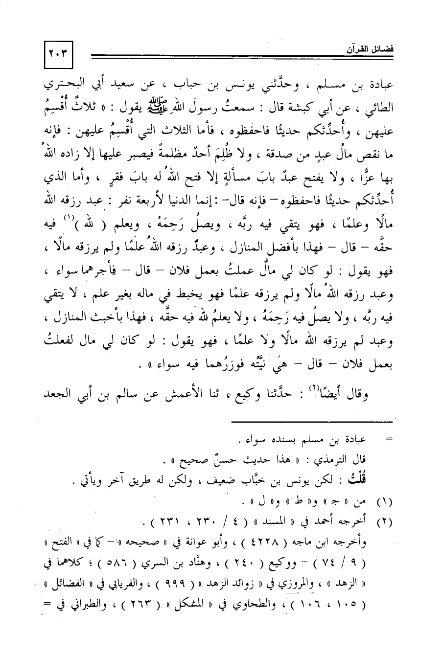 عبادة بن مسلم، وحدَّثَنِي يونس بن حباب، عن سعيد أبى البحترى الطائى، عن أبى كبشة قال: سمعت رسول الله -صَلَّى اللَّهُ عَلَيْهِ وَسَلَّمَ- يقول: "ثلاث أقسم عليهن، وأحدثكم حديثاً فاحفظوه، فأما الثلاث التى أقسم عليهن، فإنه ما نقص مال عبد من صدقة، ولا ظُلِمَ أحدٌ مظلمة فيصبر عليها الا زاده الله بها عزًّا، ولا يفتح عبد باب مسألة إلا فتح الله له باب فقر، وأما الذى أحدثكم حديثا فاحفظوه -فإنه قال: إنما الدنيا لأربعة نفر: عبد رزقه الله مالاً وعلمًا، فهو يتقى فيه ربه، ويصل رحمه، ويعلم " الله "1 فيه حقه -قال- فهذا بأفضل المنازل، وعبد رزقه الله علمًا ولم يرزقه مالاً، فهو يقول: لو كان لى مال عملت بعمل فلان -قال- فأجرهما سواء، وعبد رزقه الله مالًا ولم يرزقه علمًا فهو يخبط فى ماله بغير علم، لا يتقي فيه ربه، ولا يصل فيه رحمه، ولا يعلم لله فيه حقه، فهذا بأخبث المنازل، وعبد لم يرزقه الله مالاً ولا علمًا، فهو يقول: لو كان لى مال لفعلت بعمل فلان -قال- هى نيته فوزرهما فيه سواء".