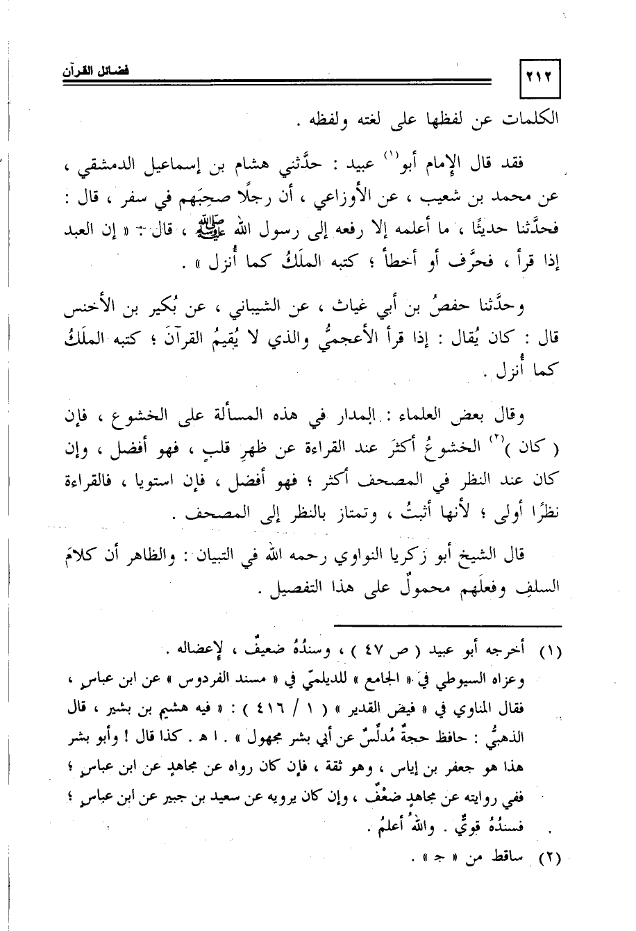 فقد قال الإمام أبو1 عبيد: حدثنى هشام بن إسماعيل الدمشقى، عن محمد بن شعيب، عن الأوزاعى، أن رجلا صحبهم فى سفر، قال: فحدَّثَنا حديثا، ما أعلمه إلا رفعه إلى رسول الله -صَلَّى اللَّهُ عَلَيْهِ وَسَلَّمَ، قال: "إن العبد إذا قرأ، فحرَّف أو أَخطَأَ؛ كتبه الملك كما أنزل".