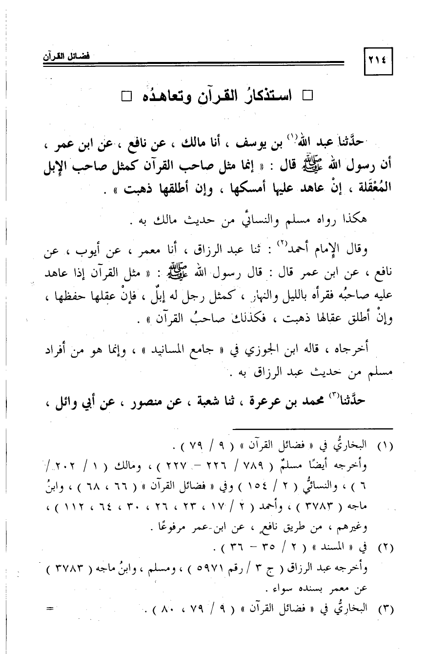 حدَّثَنَا عبد الله1 بن يوسف، أنا مالك، عن نافع، عن ابن عمر، أن رسول الله -صَلَّى اللَّهُ عَلَيْهِ وَسَلَّمَ- قال: "إنما مَثَلُ صاحب القرآن كمَثَلِ صاحب الإبل المعقلة، إن عاهد عليها أمسكها، وإن أطلقها ذهبت".