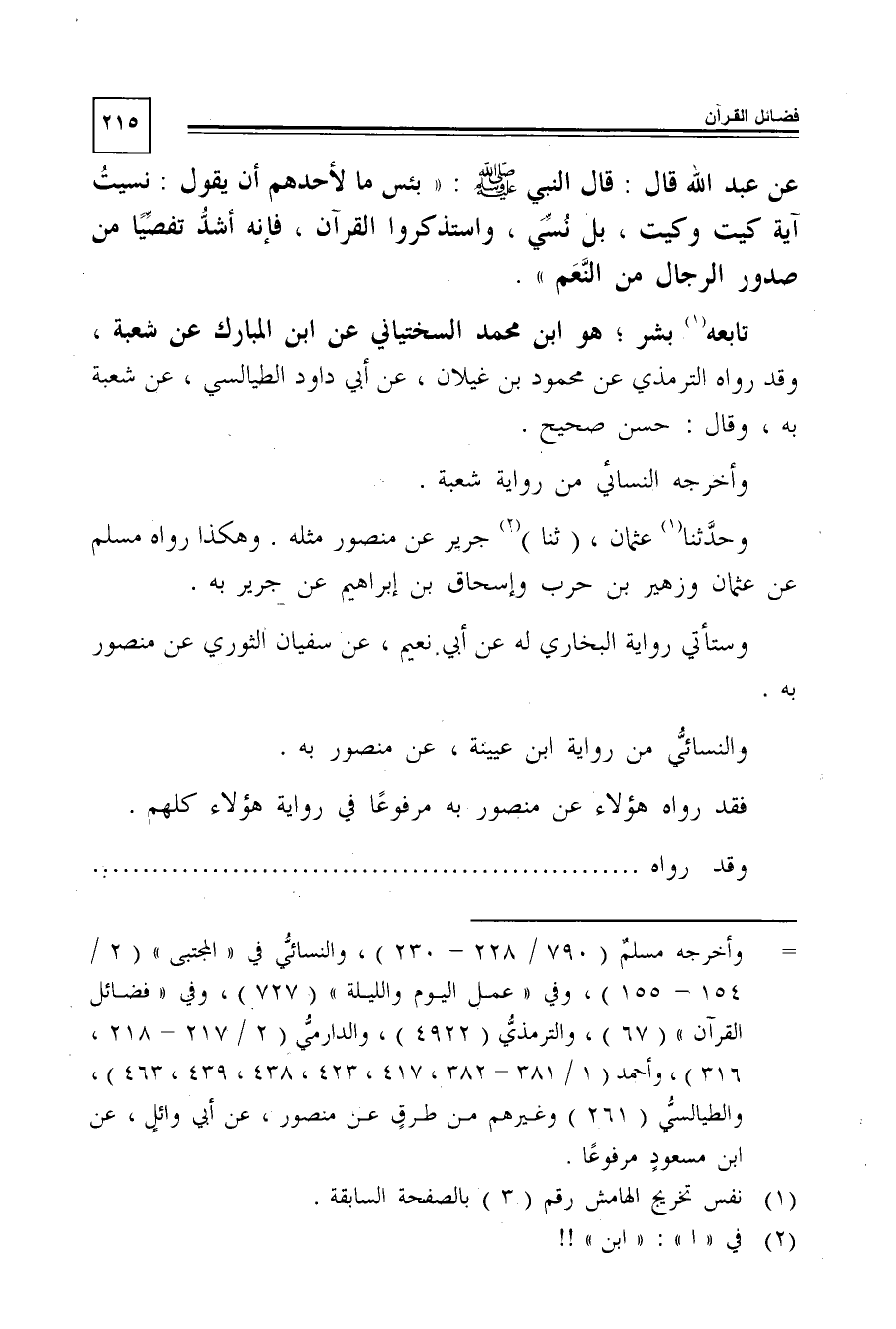 عن عبد الله قال: قال النبى -صَلَّى اللَّهُ عَلَيْهِ وَسَلَّمَ: "بئس ما لأحدهم أن يقول: نسيت آية كيت وكيت، بل نُسِّيَ، واستذكروا القرآن، فإنه أشد تفصِّيًا من صدور الرجال من النَّعَم".