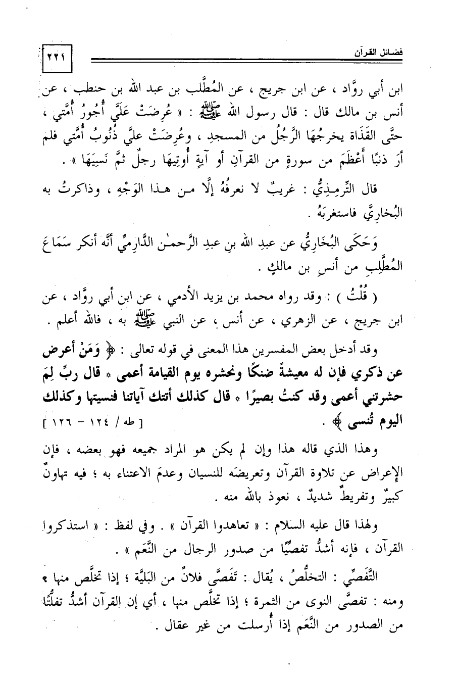 ابن أبى رواد، عن ابن جريج، عن المطَّلب بن عبد الله بن حنطب، عن أنس بن مالك قال: قال رسول الله -صَلَّى اللَّهُ عَلَيْهِ وَسَلَّمَ: "عُرِضَتْ عليَّ أجور أمتى، حتى القذاة يخرجها الرجل من المسجد، وعُرِضَتْ عليَّ ذنوب أمتى فلم أر ذنبًا أعظم من سورة من القرآن أو آية أوتيها رجل ثم نَسِيَهَا".