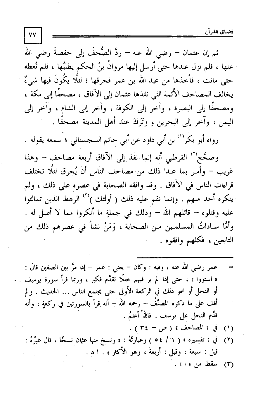 وصحَّحَ2 القرطبى أنه إنما نفذ إلى الآفاق أربعة مصاحف -وهذا غريب, وأمر بما عدا ذلك من مصاحف الناس أن يحرق لئلَّا تختلف قراءات الناس فى الآفاق, وقد وافقه الصحابة في عصره على ذلك، ولم ينكره أحمد منهم, وإنما نقم عليه ذلك "أولئك"3 الرهط الذين تمالئوا عليه وقتلوه -قاتلهم الله, وذلك فى جملة ما أنكروا مما لا أصل له, وأما سادات المسلمين من الصحابة، ومن نشأ فى عصرهم ذلك من التابعين، فكلهم وافقهوه.