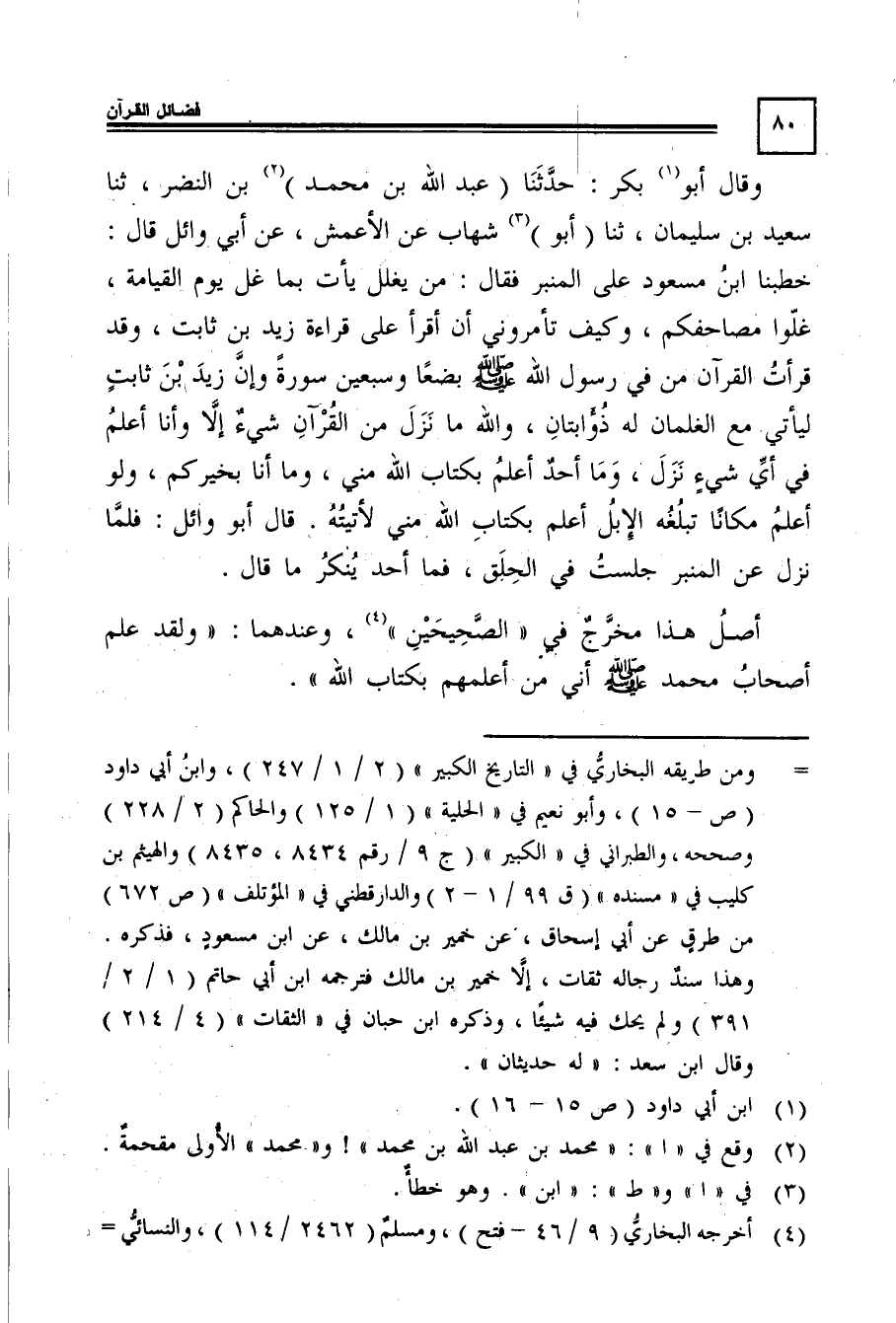 4 أخرجه البخاري "9/ 46-فتح"، ومسلم "2462/ 114"، والنسائي في "الفضائل" "22", وفي السنن "8/134", وابن سعد "2/ 343-344", وأحمد "1/ 411", والطبراني في "الكبير" "ج9/ 8448", والهيثم بن كليب في "المسند" "ق63/ 2", ويعقوب بن سفيان في "المعرفة" "2/ 537", وابن أبي داود في "المصاحف" "15", والطحاوي في "المشكل" "5595" من طرقٍ عن الأعمش, عن أبي وائل, عن ابن مسعود.