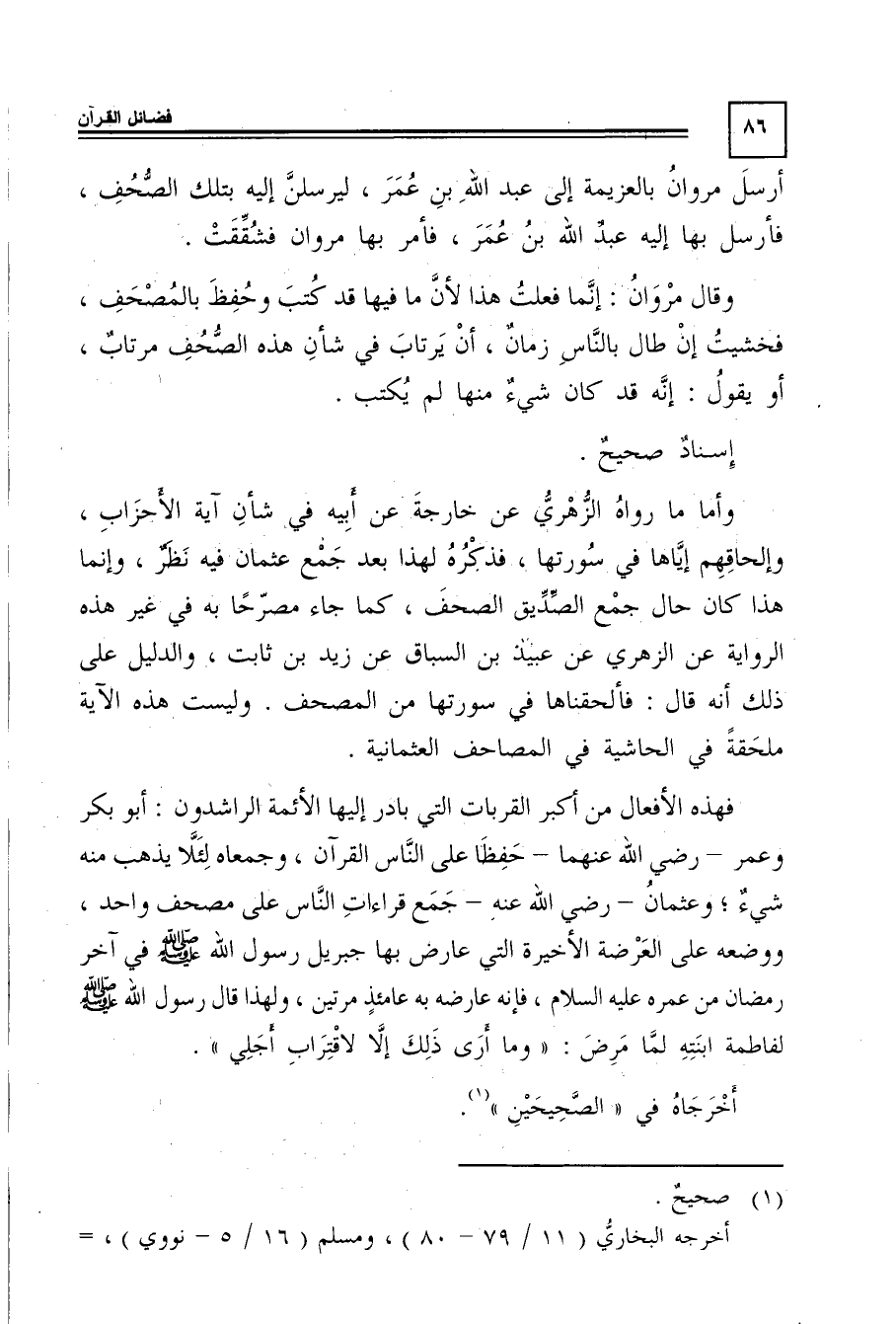 وأما ما رواه الزُّهريُّ عن خارجة عن أبيه فى شأن آية الأحزاب، والحاقهم إياها فى سورتها، فذكره لهذا بعد جمع عثمان فيه نظر، وإنما هذا كان حال جمع الصديق الصحف، كما جاء مصرحا به فى غير هذه الرواية عن الزهرى, عن عبيد بن السباق, عن زيد بن ثابت، والدليل على ذلك أنه قال: فالحقناها فى سورتها من المصحف, وليست هذه الآية ملحقة فى الحاشية في المصاحف العثمانية.