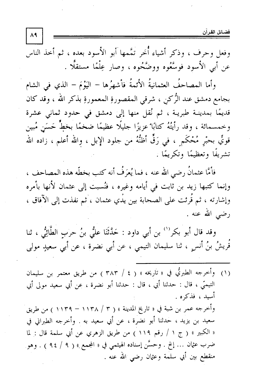 وأما المصاحف العثمانية الأئمة فأشهرها -اليوم- الذى فى الشام بجامع دمشق عند الركن، شرقي المقصوة المعمورة بذكر الله، وقد كان قديما بمدينة طبرية، ثم نُقِلَ منها إلى دمشق فى حدود ثمانى عشرة وخمسمائة، وقد رأيته كتابا عزيزا جليلا عظيمًا ضخمًا بخطٍّ حسن مبين قوى بحبر محكم، فى رق أظنه من جلود الإبل، والله أعلم، زاده الله تشريفًا وتعظيمًا وتكريمًا.