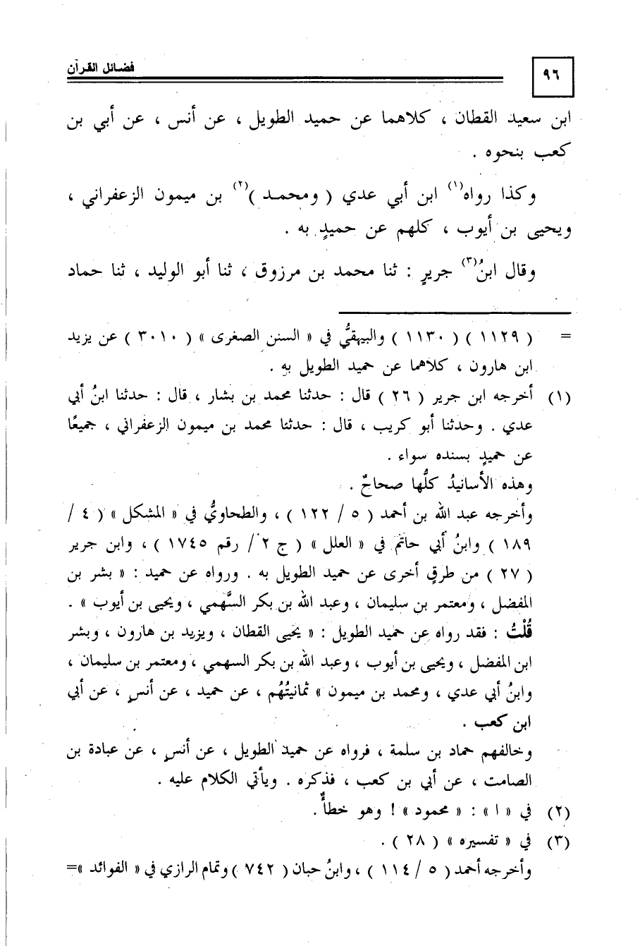 وأخرجه عبد الله بن أحمد "5/ 122"، والطحاوي في "المشكل" "4/ 189", وابن أبي حاتم في "العلل" "ج2/ رقم 1745"، وابن جرير "27" من طرقٍ أخرى عن حميد الطويل به, ورواه عن حميد: "بشر بن المفصل، ومعتمر بن سليمان، وعبد الله بن بكر السهمي، ويحيى بن أيوب", قلت: فقد رواه عن حميد الطويل: "يحيى القطان، ويزيد بن هارون، وبشر ابن المفضل، ويحيى بن أيوب، وعبد الله بن بكر السهمي، ومعتمر بن سليمان، وابن أبي عدي، ومحمد بن ميمون" ثمانيتهم، عن حميد، عن أنس، عن أُبَيِّ بن كعب.