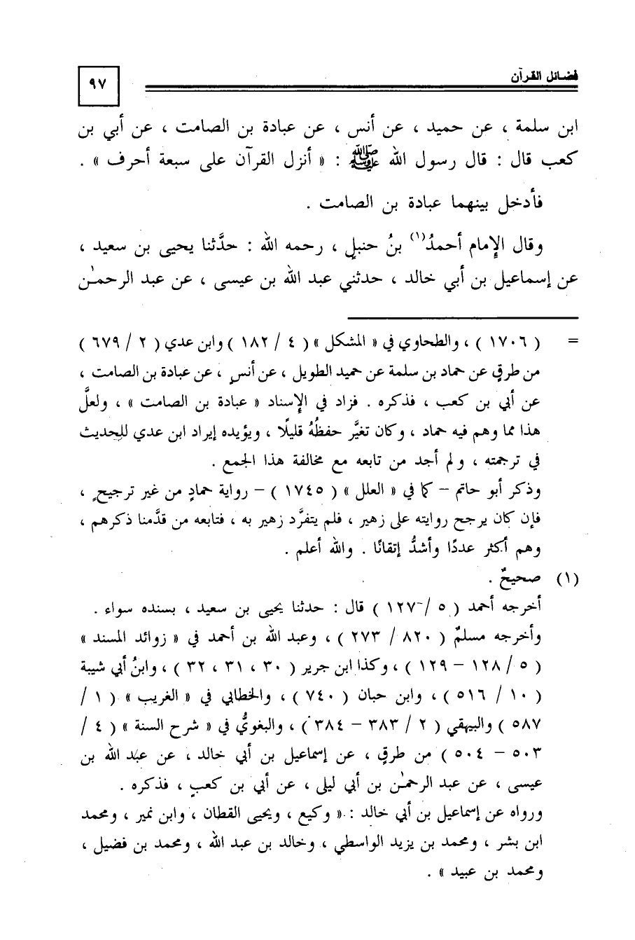 ابن سلمة، عن حميد، عن أنس، عن عبادة بن الصامت، عن أبي بن كعب قال: قال رسول الله -صَلَّى اللَّهُ عَلَيْهِ وَسَلَّمَ: "أنزل القرآن على سبعة أحرف" , فأدخل بينهما عبادة بن الصامت.
