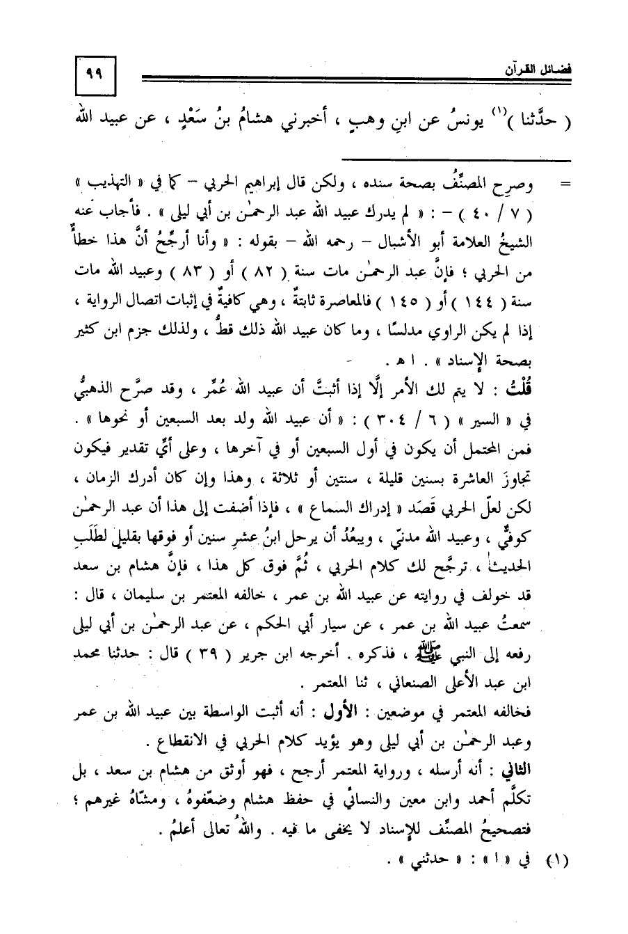 فخالفه المعتمر في موضعين: الأول: أنه أثبت الواسطة بين عبيد الله بن عمر وعبد الرحمن بن أبي ليلى وهو يؤيد كلام الحربي في الانقطاع.
