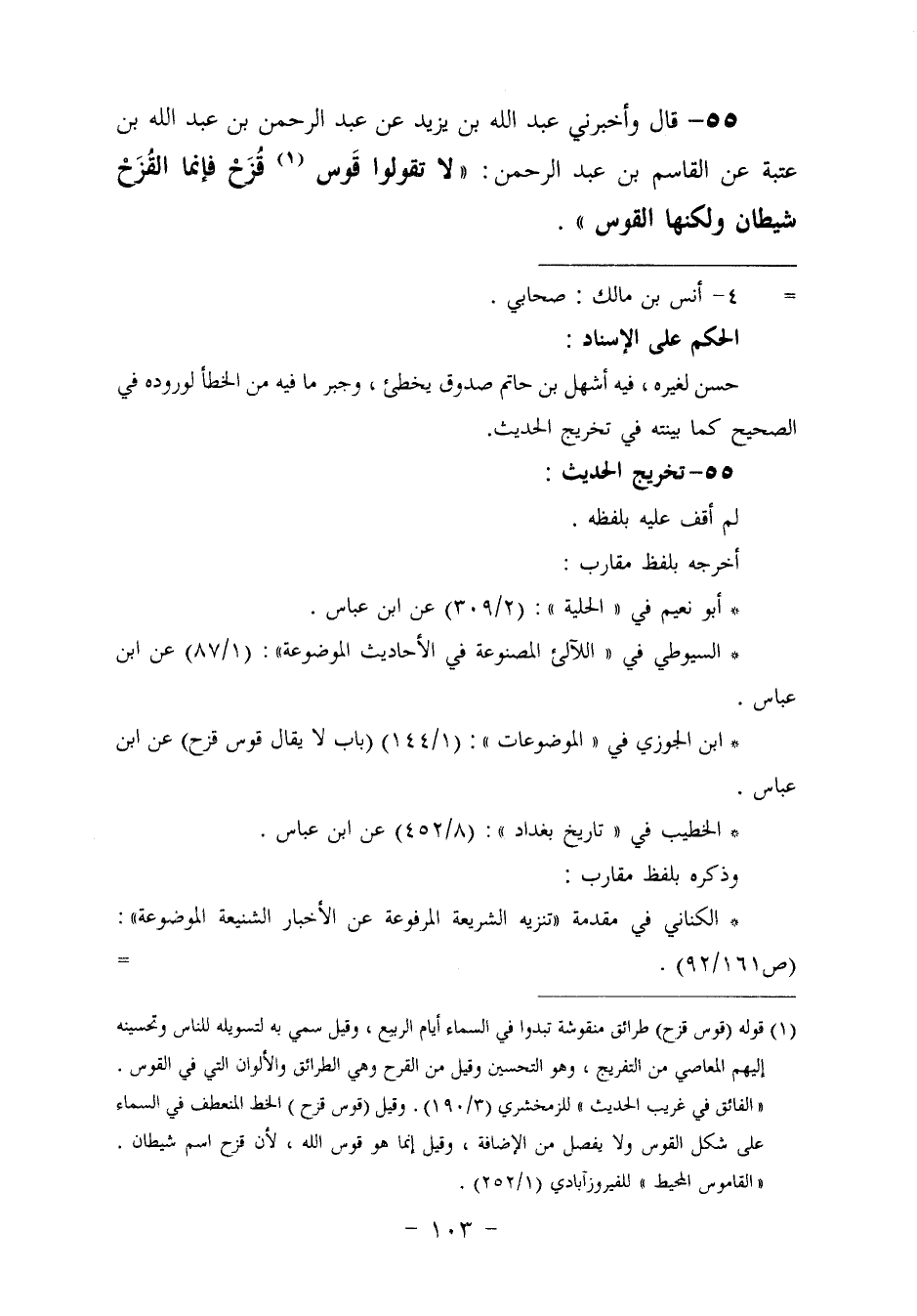 ٥٥ - وَأَخْبَرَنِي عَبْدُ اللَّهِ بْنُ يَزِيدَ، عَنْ عَبْدِ الرَّحْمَنِ بْنِ عَبْدِ اللَّهِ بْنِ عُتْبَةَ، عَنِ الْقَاسِمِ بْنِ عَبْدِ الرَّحْمَنِ: «لَا تَقُولُوا قَوْسَ قُزَحَ، فَإِنَّمَا الْقُزَحُ شَيْطَانٌ، وَلَكِنَّهَا الْقَوْسُ»