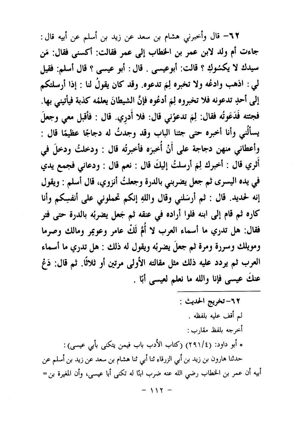 ٦٢ - وَأَخْبَرَنِي هِشَامُ بْنُ سَعْدٍ، عَنْ زَيْدِ بْنِ أَسْلَمَ، عَنْ أَبِيهِ، قَالَ: جَاءَتْ أُمُّ وَلَدٍ لِابْنِ عُمَرَ بْنِ الْخَطَّابِ، إِلَى عُمَرَ، فَقَالَتِ: اكْسُنِي، فَقَالَ: مَنْ سَيِّدُكِ، لَا يَكْسُوكِ؟ قَالَتْ: أَبُو عِيسَى. قَالَ: أَبُو عِيسَى؟ قَالَ أَسْلَمَ: فَقِيلَ لِي: اذْهَبْ وادْعُهُ وَلَا تُخْبِرْهُ لِمَ تَدْعُوهُ. وَقَدْ كَانَ يَقُولُ لَنَا: إِذَا أَرْسَلْتُكُمْ إِلَى أَحَدٍ تَدْعُونَهُ فَلَا تُخْبِرُوهُ لِمَ أَدْعُوهُ فَإِنَّ الشَّيْطَانَ يُعَلِّمُهُ كِذْبَةً فَيَأْتِينِي بِهَا. فَجِئْتُهُ فَدَعَوْتُهُ، فَقَالَ: لِمَ تَدْعُونِي؟ قَالَ: فَلَا أَدْرِي. قَالَ: فَأَقْبَلَ مَعِيَ وَجَعَلَ يَسْأَلُنِي، وَأَنَا أُخْبِرُهُ حَتَّى جِئْنَا الْبَابَ، وَقَدْ وَجَدْتُ لَهُ دَجَاجًا عَظِيمًا، قَالَ: وَأَعْطَانِي مِنْهُنَّ دَجَاجَةً عَلَى أَنْ أُخْبِرَهُ، فَأَخْبَرْتُهُ، قَالَ: وَدَخَلْتُ ودَخَلَ فِي أَثَرِي، قَالَ: أَخْبَرَكَ لِمَ أَرْسَلْتُ إِلَيْكَ، قَالَ: نَعَمْ، قَالَ: وَدَعَانِي فَجَمَعَ يَدَيَّ فِي يَدِهِ الْيُسْرَى، ثُمَّ جَعَلَ يَضْرِبُنِي بِالدِّرَّةِ وَجَعَلْتُ أَنْزَوِي، قَالَ أَسْلَمُ: وَيَقُولُ إِنَّهُ لَحَدِيدٌ. قَالَ: ثُمَّ أَرْسَلَنِي، وَقَالَ: " وَاللَّهِ إِنَّكُمْ تَحْمِلُونِي عَلَى أَنْفُسِكُمْ وَأَنَا كَارِهٌ، ثُمَّ قَامَ إِلَى ابْنِهِ فَلَوْ أَرَادَهُ فِي عُنُقِهِ، ثُمَّ جَعَلَ يَضْرِبُهُ بِالدِّرَّةِ حَتَّى فَتَرَ، فَقَالَ: هَلْ تَدْرِي مَا أَسْمَاءُ الْعَرَبِ لَا أُمَّ لَكَ؟ عَامِرٌ، وَعُوَيْمِرٌ، وَمَالِكٌ، وَصِرْمٌ، وَمُوَيْلِكٌ، وسَرَرَةُ، هُوَ مُرَّةُ، ثُمَّ جَعَلَ يَضْرِبُهُ وَيَقُولُ لَهُ ذَلِكَ: هَلْ تَدْرِي مَا أَسْمَاءُ الْعَرَبِ؟، ثُمَّ يُرَدِّدُ عَلَيْهِ ذَلِكَ مِثْلَ مَقَالَتِهِ الْأُولَى مَرَّتَيْنِ أَوْ ثَلَاثًا، ثُمَّ قَالَ: دَعْ عَنْكَ عِيسَى، فَإِنَّا وَاللَّهِ مَا نَعْلَمُ لِعِيسَى أَبًا "