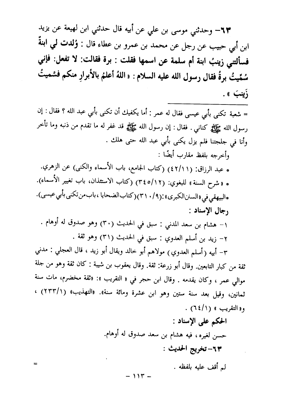 ٦٣ - وَحَدَّثَنِي مُوسَى بْنُ عُلَيِّ، عَنْ أَبِيهِ، قَالَ: حَدَّثَنِي ابْنُ لَهِيعَةَ، عَنْ يَزِيدَ بْنِ أَبِي حَبِيبٍ، عَنْ رَجُلٍ، عَنْ مُحَمَّدِ بْنِ عَمْرِو بْنِ عَطَاءٍ، قَالَ: وُلِدَتْ لِيَ ابْنَةٌ، فَسَأَلَتْنِي زَيْنَبُ ابْنَةُ أُمِّ سَلَمَةَ، عَنِ اسْمِهَا، فَقُلْتُ: بَرَّةُ، فَقَالَتْ: لَا تَفْعَلْ، فَإِنِّي سُمِّيتُ بَرَّةُ، فَقَالَ رَسُولُ اللَّهِ عَلَيْهِ السَّلَامُ: «اللَّهُ أَعْلَمُ بِالْأَبْرَارِ مِنْكُمْ» سُمِّيَتْ زَيْنَبَ "
