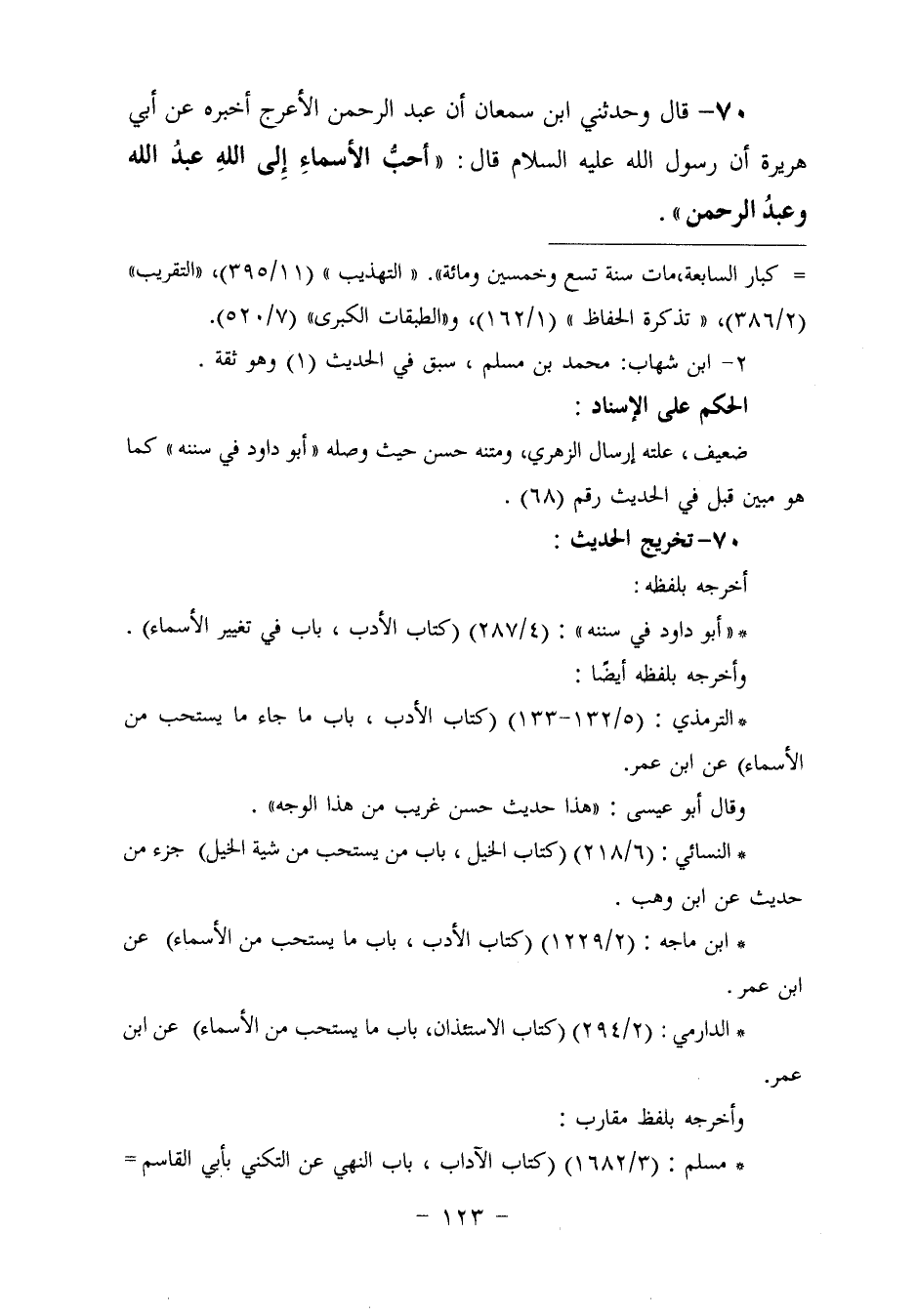 ٧٠ - وَحَدَّثَنِي ابْنُ سَمْعَانَ، أَنَّ عَبْدَ الرَّحْمَنِ الْأَعْرَجَ، أَخْبَرَهُ، عَنْ أَبِي هُرَيْرَةَ، أَنَّ رَسُولَ اللَّهِ عَلَيْهِ السَّلَامُ قَالَ: «أَحَبُّ الْأَسْمَاءِ إِلَى اللَّهِ عَبْدُ اللَّهِ، وَعَبْدُ الرَّحْمَنِ»