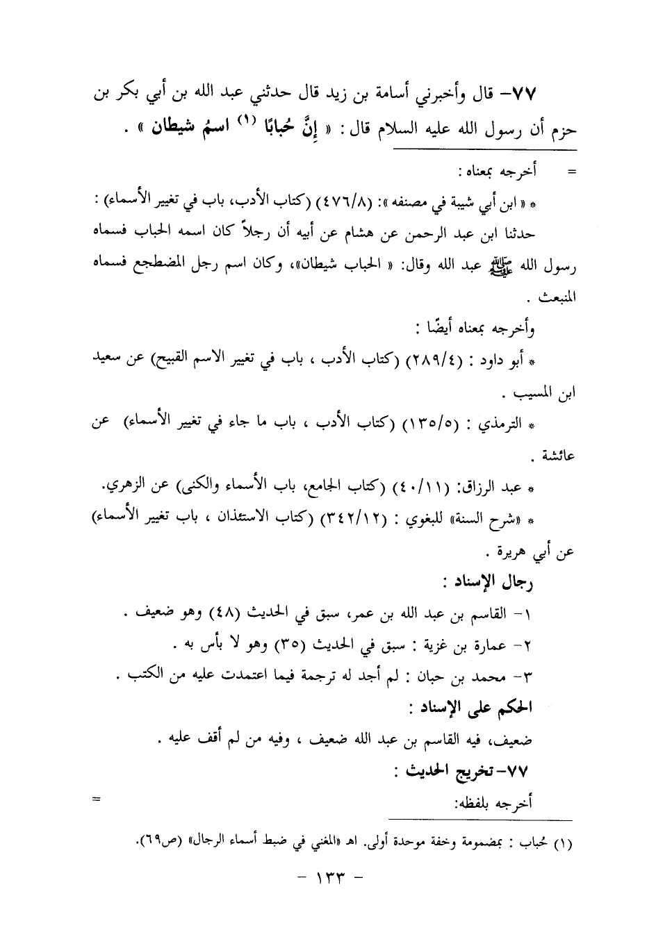 ٧٧ - وَأَخْبَرَنِي أُسَامَةُ بْنُ زَيْدٍ، قَالَ: حَدَّثَنِي عَبْدُ اللَّهِ بْنُ أَبِي بَكْرِ بْنِ حَزْمٍ، أَنَّ رَسُولَ اللَّهِ عَلَيْهِ السَّلَامُ قَالَ: «إِنَّ حُبَابًا اسْمُ شَيْطَانٍ»