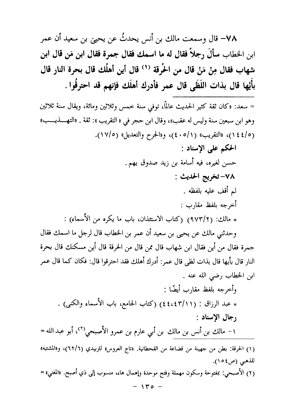 ٧٨ - وَسَمِعْتُ مَالِكَ بْنَ أَنَسٍ، يُحَدِّثُ عَنْ يَحْيَى بْنِ سَعِيدٍ، أَنَّ عُمَرَ بْنَ الْخَطَّابِ، سَأَلَ رَجُلًا فَقَالَ لَهُ: مَا اسْمُكَ؟ فَقَالَ: جَمْرَةُ، فَقَالَ: ابْنُ مَنْ؟ قَالَ: ابْنُ شِهَابٍ، فَقَالَ: مِنْ مَنْ؟ قَالَ: مِنَ الْحُرَقَةِ، قَالَ: أَيْنَ أَهْلُكَ؟ قَالَ: بِحِرَّةِ النَّارِ، قَالَ: بِأَيِّهَا؟ قَالَ: بِذَاتِ الْلَظَى، قَالَ عُمَرُ: «فَأَدْرِكْ أَهْلَكَ فَإِنَّهُمْ قَدِ احْتَرَقُوا»
