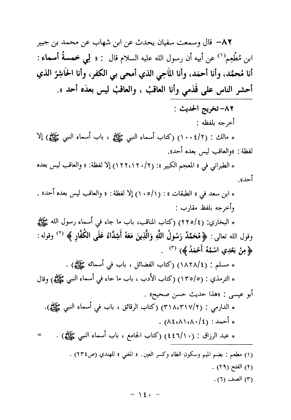 ٨٢ - وَسَمِعْتُ سُفْيَانَ، يُحَدِّثُ عَنِ ابْنِ شِهَابٍ، عَنْ مُحَمَّدِ بْنِ جُبَيْرِ بْنِ مُطْعِمٍ، عَنْ أَبِيهِ، أَنَّ رَسُولَ اللَّهِ عَلَيْهِ السَّلَامُ قَالَ: " لِي خَمْسَةُ أَسْمَاءٍ: أَنَا مُحَمَّدٌ، وَأَنَا أَحْمَدُ، وَأَنَا الْمَاحِي الَّذِي أُمْحِيَ بِيَ الْكُفْرُ، وَأَنَا الْحَاشِرُ الَّذِي أَحْشُرُ النَّاسَ عَلَى قَدَمَيَّ، وَأَنَا الْعَاقِبُ، وَالْعَاقِبُ لَيْسَ بَعْدَهُ أَحَدٌ "