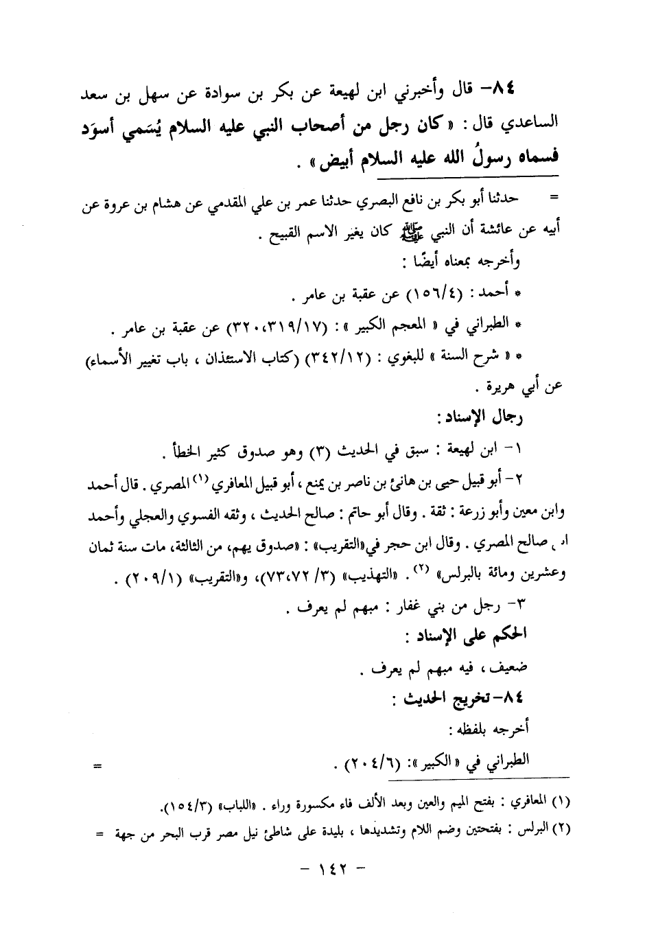 ٨٤ - وَأَخْبَرَنِي ابْنُ لَهِيعَةَ، عَنْ بَكْرِ بْنِ سَوَادَةَ، عَنْ سَهْلِ بْنِ سَعْدٍ السَّاعِدِيِّ، قَالَ: «كَانَ رَجُلٌ مِنْ أَصْحَابِ النَّبِيِّ عَلَيْهِ السَّلَامُ يُسَمَّى أَسْوَدَ،» فَسَمَّاهُ رَسُولُ اللَّهِ عَلَيْهِ السَّلَامُ أَبْيَضَ "