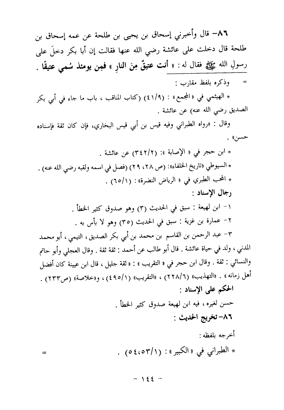 ٨٦ - وَأَخْبَرَنِي إِسْحَاقُ بْنُ يَحْيَى بْنِ طَلْحَةَ، عَنْ عَمِّهِ إِسْحَاقَ بْنِ طَلْحَةَ قَالَ: دَخَلْتُ عَلَى عَائِشَةَ رَضِيَ اللَّهُ عَنْهَا فَقَالَتْ: " إِنَّ أَبَا بَكْرٍ دَخَلَ عَلَى رَسُولِ اللَّهِ صَلَّى اللهُ عَلَيْهِ وَسَلَّمَ فَقَالَ لَهُ: «أَنْتَ عَتِيقٌ مِنَ النَّارِ» فَمِنْ يَوْمَئِذٍ سُمِّيَ عَتِيقًا "