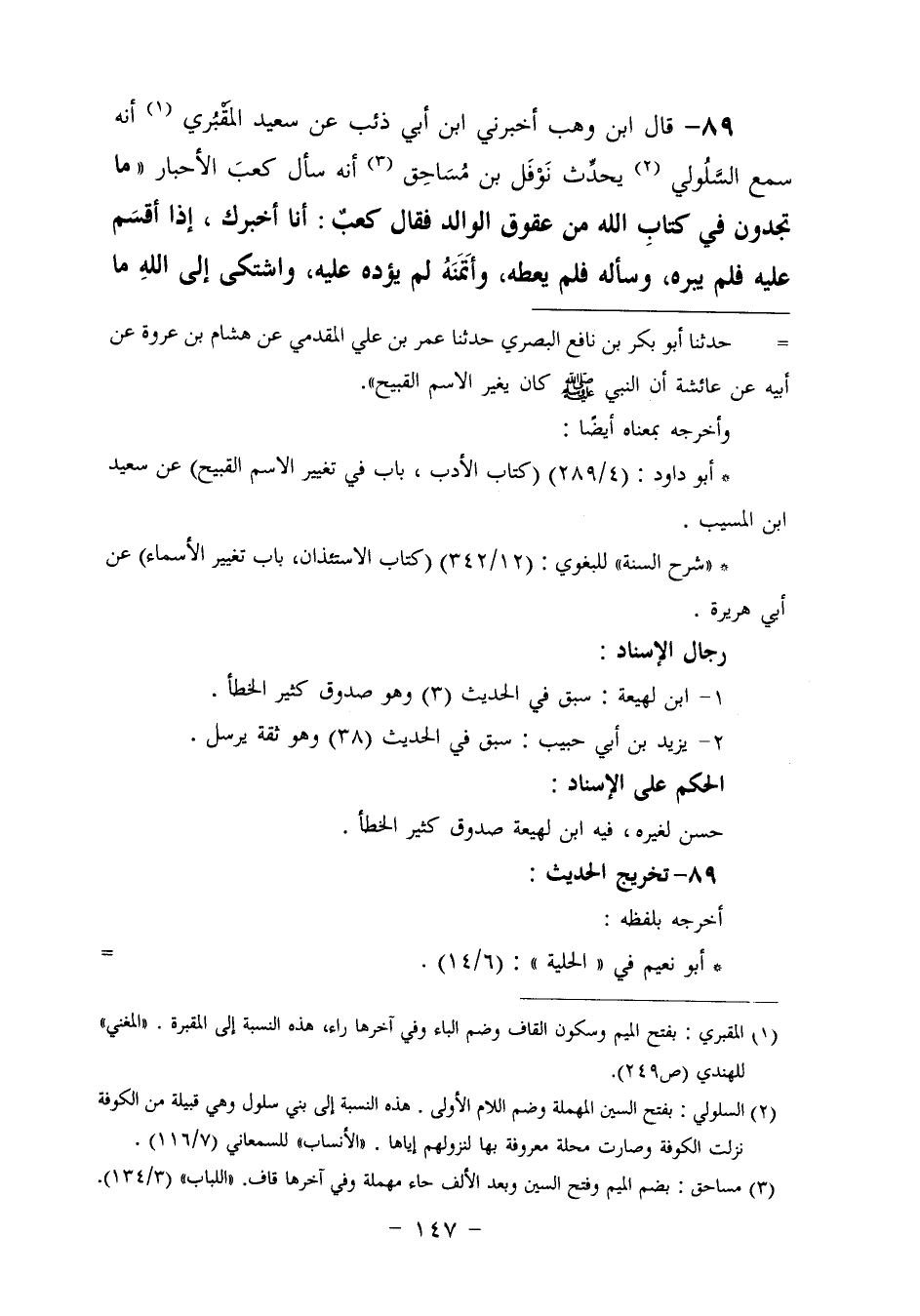 ٨٩ - قَالَ ابْنُ وَهْبٍ: أَخْبَرَنِي ابْنُ أَبِي ذِئْبٍ، عَنْ سَعِيدٍ الْمَقْبُرِيِّ، أَنَّهُ سَمِعَ السَّلُولِيَّ، يُحَدِّثُ نَوْفَلَ بْنَ مُسَاحِقٍ، أَنَّهُ سَأَلَ كَعْبَ الْأَحْبَارِ: مَا تَجِدُونَ فِي كِتَابِ اللَّهِ مِنْ عُقُوقِ الْوَالِدِ؟، فَقَالَ كَعْبٌ: «أَنَا أُخْبِرُكُ،» إِذَا أَقْسَمَ عَلَيْهِ فَلَمْ يَبِرَّهُ، وَسَأَلَهُ فَلَمْ يُعْطِهِ، وَائْتَمَنَهُ فَلَمْ يُؤدِّهْ عَلَيْهِ، وَاشْتَكَى إِلَى اللَّهِ مَا ⦗١٤٨⦘ يَلْقَى مِنْهُ، فَذَلِكَ الْعُقُوقُ كُلُّهُ "