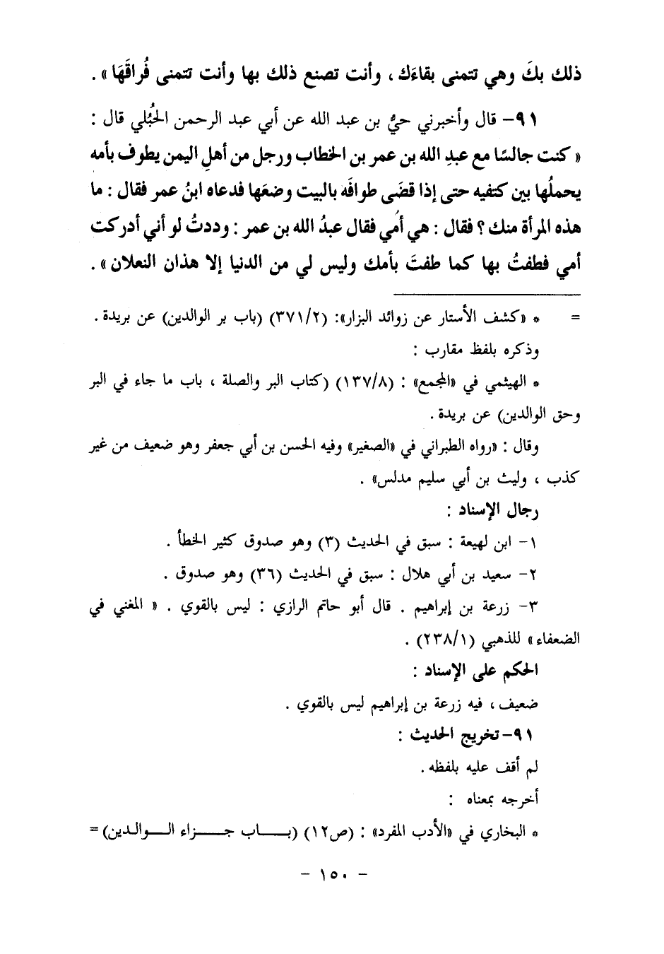 ٩١ - قَالَ: وَأَخْبَرَنِي حُيَيُّ بْنُ عَبْدِ اللَّهِ، عَنْ أَبِي عَبْدِ الرَّحْمَنِ الْحُبُلِيِّ، قَالَ: كُنْتُ جَالِسًا مَعَ عَبْدِ اللَّهِ بْنِ عُمَرَ بْنِ الْخَطَّابِ، وَرَجُلٌ مِنْ أَهْلِ الْيَمَنِ يَطُوفُ بِأُمِّهِ يَحْمِلُهَا بَيْنَ كَتِفَيْهِ، حَتَّى إِذَا قَضَى طَوَافَهُ بِالْبَيْتِ وَضَعَهَا، فَدَعَاهُ ابْنُ عُمَرَ، فَقَالَ: مَا هَذِهِ الْمَرْأَةُ مِنْكَ؟ فَقَالَ: هِيَ أُمِّي، فَقَالَ عَبْدُ اللَّهِ بْنُ عُمَرَ: «وَدِدْتُ لَوْ أَنِّي أَدْرَكْتُ أُمِّي فَطُفْتُ بِهَا كَمَا طُفْتَ بِأُمِّكِ وَلَيْسَ لِي مِنَ الدُّنْيَا إِلَّا هَذَانِ النَّعْلَانِ»