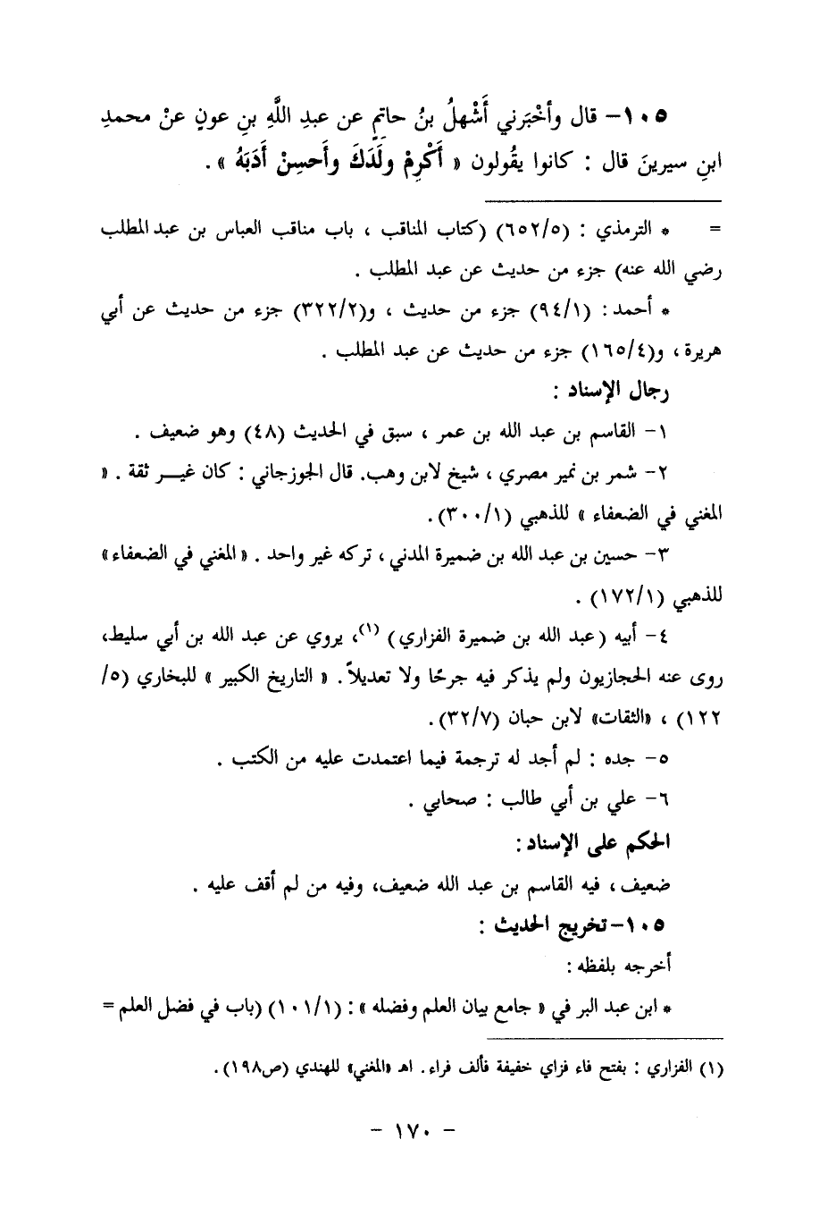 ١٠٥ - وَأَخْبَرَنِي أَشْهَلُ بْنُ حَاتِمٍ، عَنْ عَبْدِ اللَّهِ بْنِ عَوْنٍ، عَنْ مُحَمَّدِ بْنِ سِيرِينَ، قَالَ: كَانُوا يَقُولُونَ: «أَكْرِمْ وَلَدَكَ وَأَحْسِنْ أَدَبَهُ»