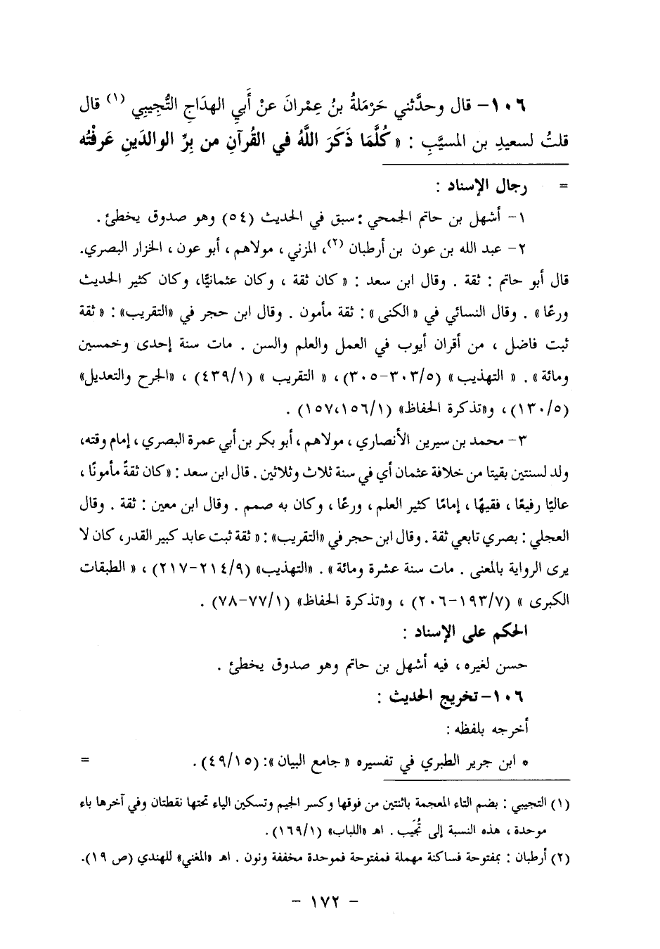 ١٠٦ - وَحَدَّثَنِي حَرْمَلَةُ بْنُ عِمْرَانَ، عَنْ أَبِي الْهُدَاجِ التُّجِيبِيِّ، قَالَ: قُلْتُ لِسَعِيدِ بْنِ الْمُسَيِّبِ: " كُلَّمَا ذَكَرَ اللَّهُ فِي الْقُرْآنِ مِنْ بِرِّ الْوَالِدَيْنِ عَرَفْتُهُ ⦗١٧٣⦘ إِلَّا قَوْلَهُ: {وَقُلْ لَهُمَا قَوْلًا كَرِيمًا} [الإسراء: ٢٣] مَا هَذَا الْقَوْلُ الْكَرِيمُ؟، فَقَالَ ابْنُ الْمُسَيِّبِ: «قَوْلُ الْعَبْدِ الْمُذْنِبِ لِلسَّيِّدِ الْفَظِّ»
