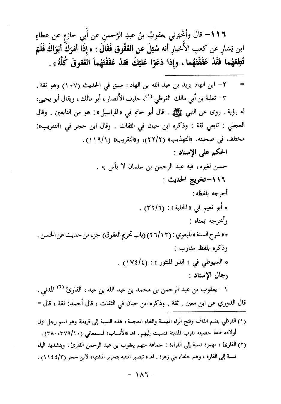 ١١٦ - وَأَخْبَرَنِي يَعْقُوبُ بْنُ عَبْدِ الرَّحْمَنِ، عَنْ أَبِي حَازِمٍ، عَنْ عَطَاءِ بْنِ يَسَارٍ، عَنْ كَعْبِ الْأَحْبَارِ، أَنَّهُ سُئِلَ عَنِ الْعُقُوقِ، فَقَالَ: «إِذَا أَمَرَكَ أَبَوَاكَ فَلَمْ تُطِعْهُمَا فَقَدْ عَقَقْتَهُمَا، وَإِذَا دَعَوْا عَلَيْكَ فَقَدْ عَقَقْتَهُمَا الْعُقُوقَ كُلَّهُ»