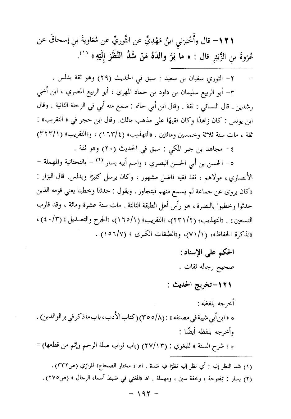 ١٢١ - وَأَخْبَرَنِي ابْنُ مَهْدِيٍّ، عَنِ الثَّوْرِيِّ، عَنْ مُعَاوِيَةَ بْنِ إِسْحَاقَ، عَنْ عُرْوَةَ بْنِ الزُّبَيْرِ، قَالَ: «مَا بَرَّ وَالِدَهُ مَنْ شَدَّ النَّظَرَ إِلَيْهِ»