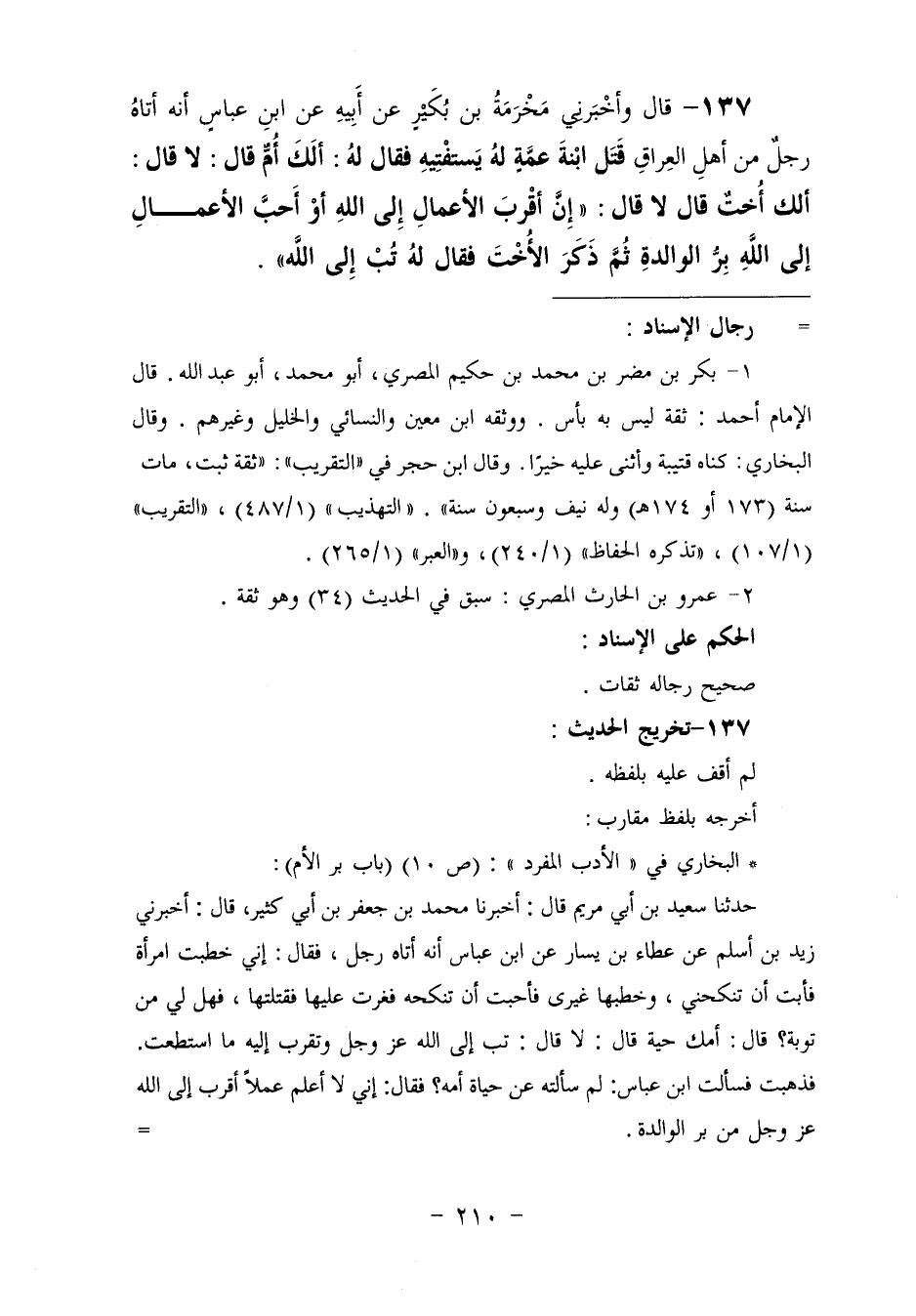 ١٣٧ - وَأَخْبَرَنِي مَخْرَمَةُ بْنُ بُكَيْرٍ، عَنْ أَبِيهِ، عَنِ ابْنِ عَبَّاسٍ، أَنَّهُ أَتَاهُ رَجُلٌ مِنْ أَهْلِ الْعِرَاقِ قَتَلَ ابْنَةَ عَمَّةٍ لَهُ يَسْتَفْتِيهِ، فَقَالَ لَهُ: أَلَكَ أُمٌّ؟ قَالَ: لَا. قَالَ: أَلَكَ أُخْتٌ؟ قَالَ: لَا، قَالَ: " إِنَّ أَقْرَبَ الْأَعْمَالِ إِلَى اللَّهِ، أَوْ أَحَبُّ الْأَعْمَالِ إِلَى اللَّهِ بِرُّ الْوَالِدَةِ، ثُمَّ ذَكَرَ الْأُخْتَ، فَقَالَ لَهُ: تُبْ إِلَى اللَّهِ "