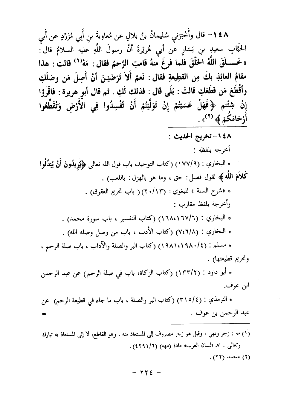 ١٤٨ - وَأَخْبَرَنِي سُلَيْمَانُ بْنُ بِلَالٍ، عَنْ مُعَاوِيَةَ بْنِ أَبِي مُزَرِّدٍ، عَنْ أَبِي الْحُبَابِ سَعِيدِ بْنِ يَسَارٍ، عَنْ أَبِي هُرَيْرَةَ، أَنَّ رَسُولَ اللَّهِ عَلَيْهِ السَّلَامُ قَالَ: " خَلَقَ اللَّهُ الْخَلْقَ فَلَمَّا فَرَغَ مِنْهُ قَامَتِ الرَّحِمُ، فَقَالَ: مَهْ، قَالَتْ: هَذَا مَقَامُ الْعَائِذِ بِكَ مِنَ الْقَطِيعَةِ، فَقَالَ: نَعَمْ، أَلَا تَرْضَيْنَ أَنْ أَصِلَ مَنْ وَصَلَكِ، وَأَقْطَعَ مَنْ قَطَعَكِ؟ قَالَتْ: بَلَى. قَالَ: فَذَلِكَ لَكِ " ثُمَّ قَالَ أَبُو هُرَيْرَةَ: فَاقْرَءُوا إِنْ شِئْتُمْ " {فَهَلْ عَسَيْتُمْ إِنْ تَوَلَّيْتُمْ أَنْ تُفْسِدُوا فِي الْأَرْضِ وَتُقَطِّعُوا أَرْحَامَكُمْ} [محمد: ٢٢] "